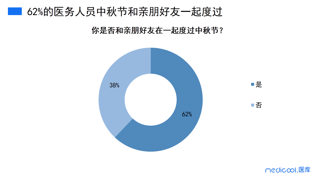 根据调研数据得出,62%的医务人员和亲朋好友度过这个珍贵的中秋节,38%的医务人员不能和亲朋好友度过中秋节。