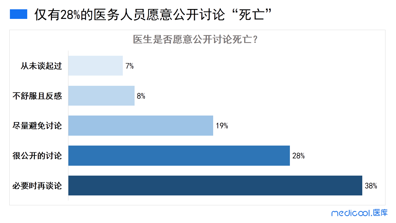 作为专业的医务工作者,仅有28%的医务工作者愿意公开讨论死亡,8%的医务工作者对讨论死亡很反感,19%的人尽量避免讨论死亡,38%的医务工作者会在必要时再谈论死亡。