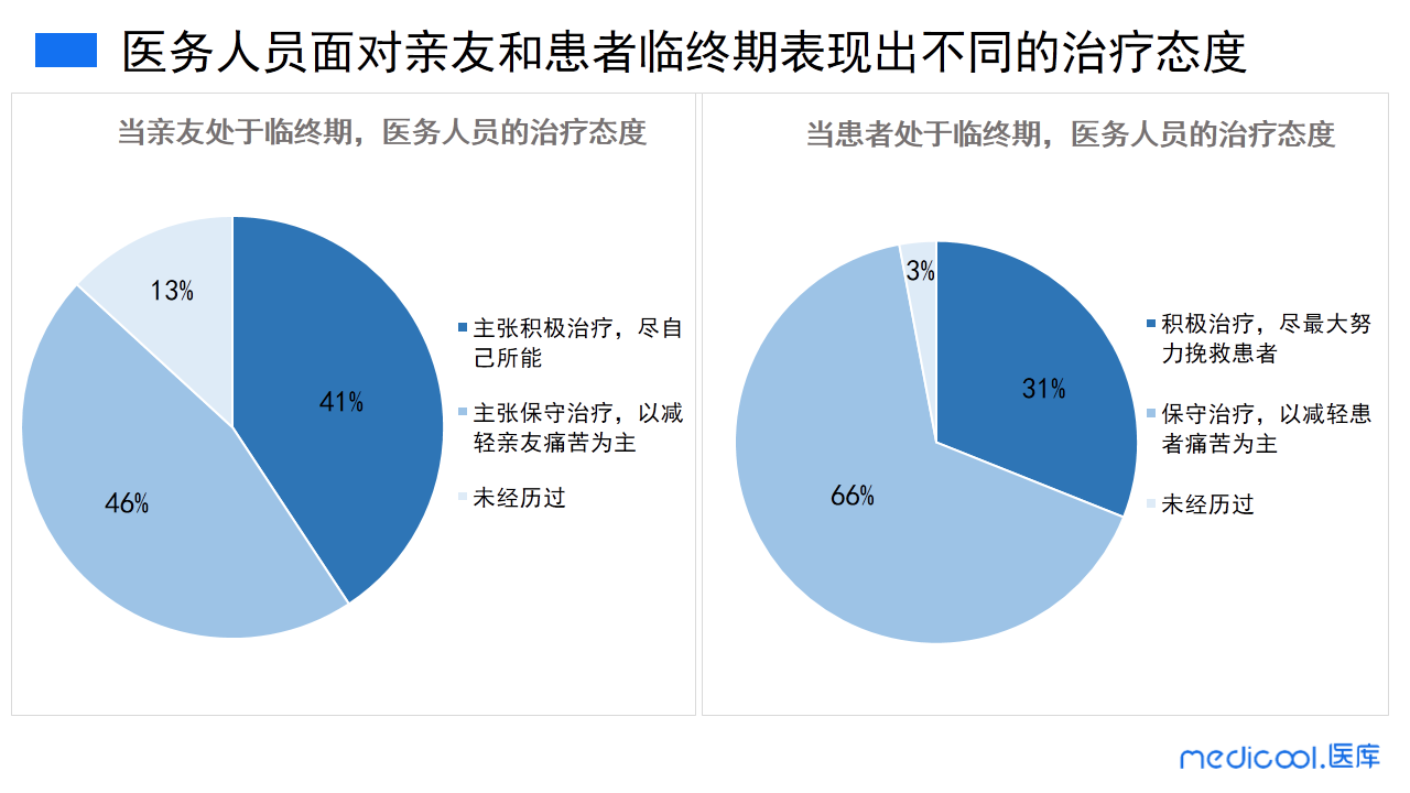 面对亲友即将离世,一般人都会无法理性选择治疗方式。作为专业的医务工作者,在面临亲友处于临终期时,41%的医务工作者主张积极治疗,尽自己所能救助亲友;46%的医务工作者主张保守治疗,以减轻亲友痛苦为主。