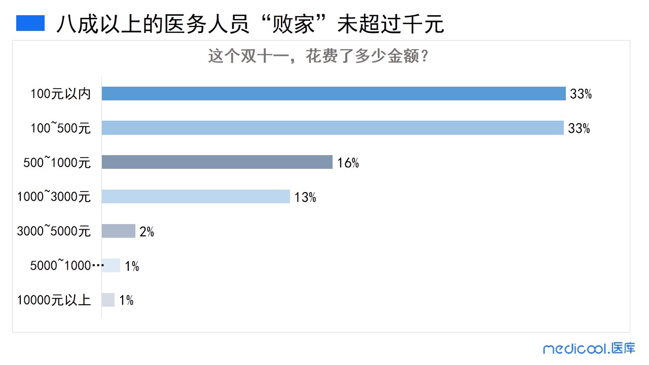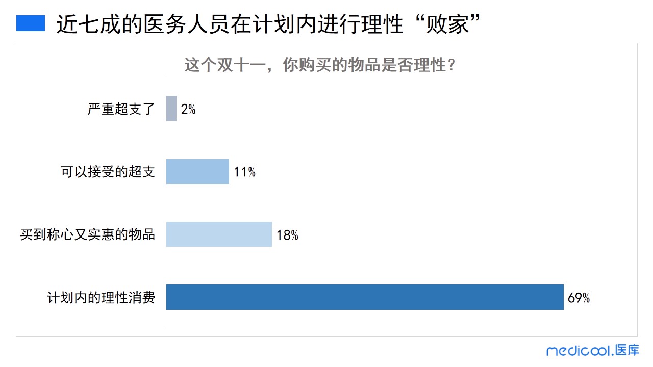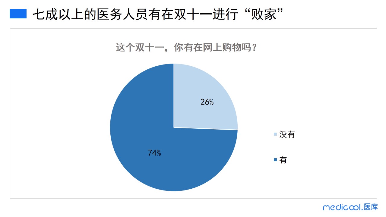 回顾今年的双十一,74%的医务人员进行了“败家”行动,26%的医务人员则一毛钱没花,究其原因,主要是因为忙,没有时间来凑热闹。