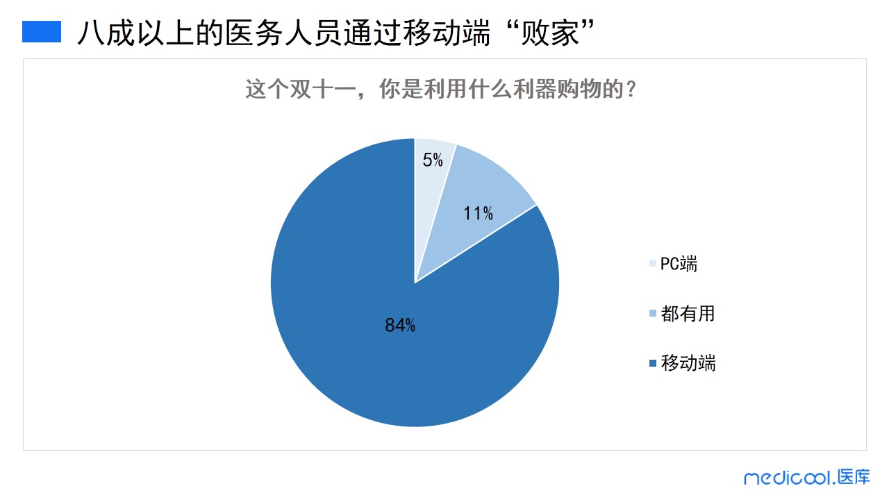 医务人员是利用什么利器买买买的呢?由调研数据可以看出,84%的医务人员通过移动端来购物,看来手机和平板已经成为败家的主要利器。