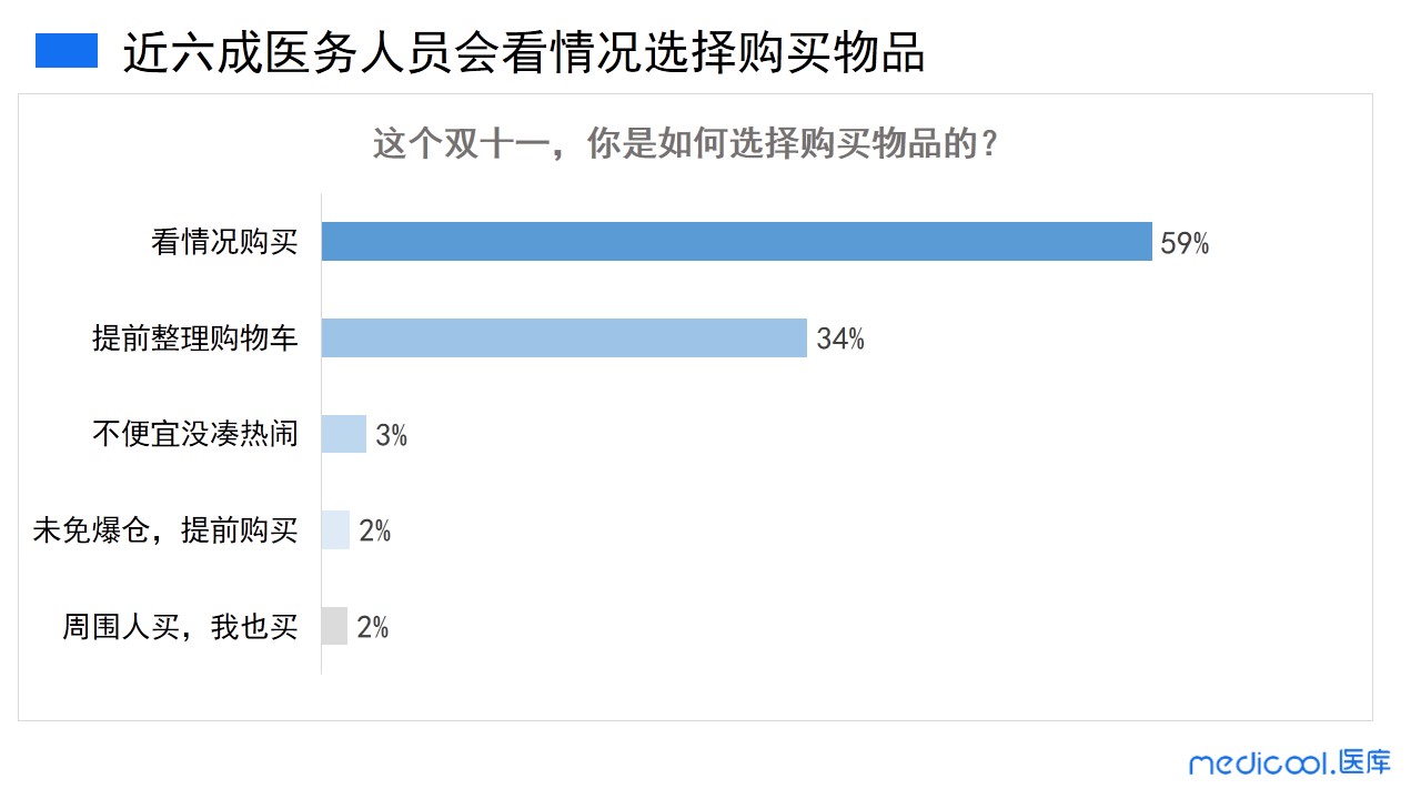 59%的医务人员看情况选择购买物品;34%的医务人员选择提前整理购物车;2%的医务人员避免爆仓,提前购买;2%的医务人员会跟风购买物品,周围人买,我也买;3%的医务人员对于不便宜的商品就不凑热闹。