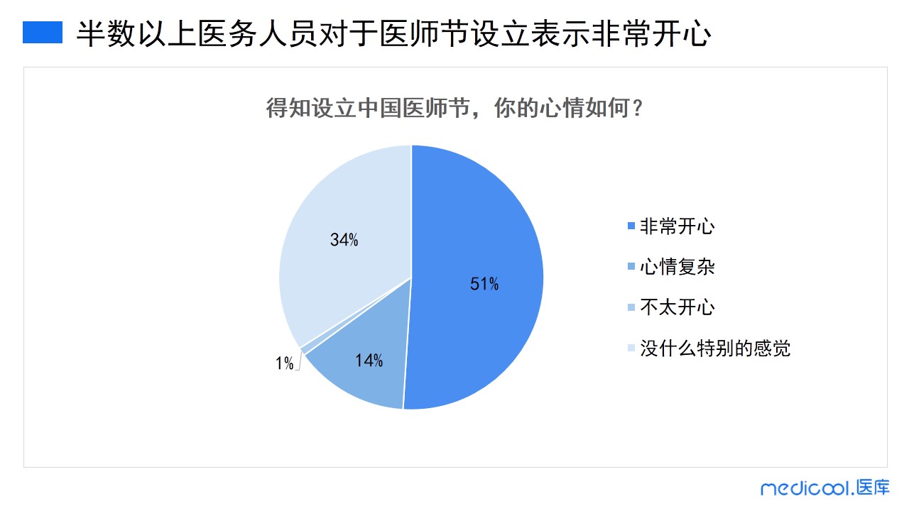 由调研数据可以看出,51%的医务人员表示非常开心,14%的医务人员却表示心情复杂,有1%的医务人员居然表示不太开心,剩下34%的医务人员表示没有什么特别的感觉。