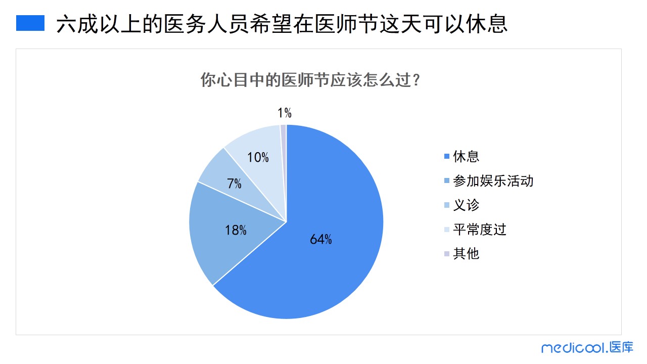 医生心目中的医师节该如何度过?超六成的医务人员希望可以在这一天得到休息,18%的医务人员表示可以参加一些娱乐活动进行庆祝,有7%的医务人员提议利用这宝贵的一天来进行义诊,另外有10%的医务人员认为平常度过这一天即可。