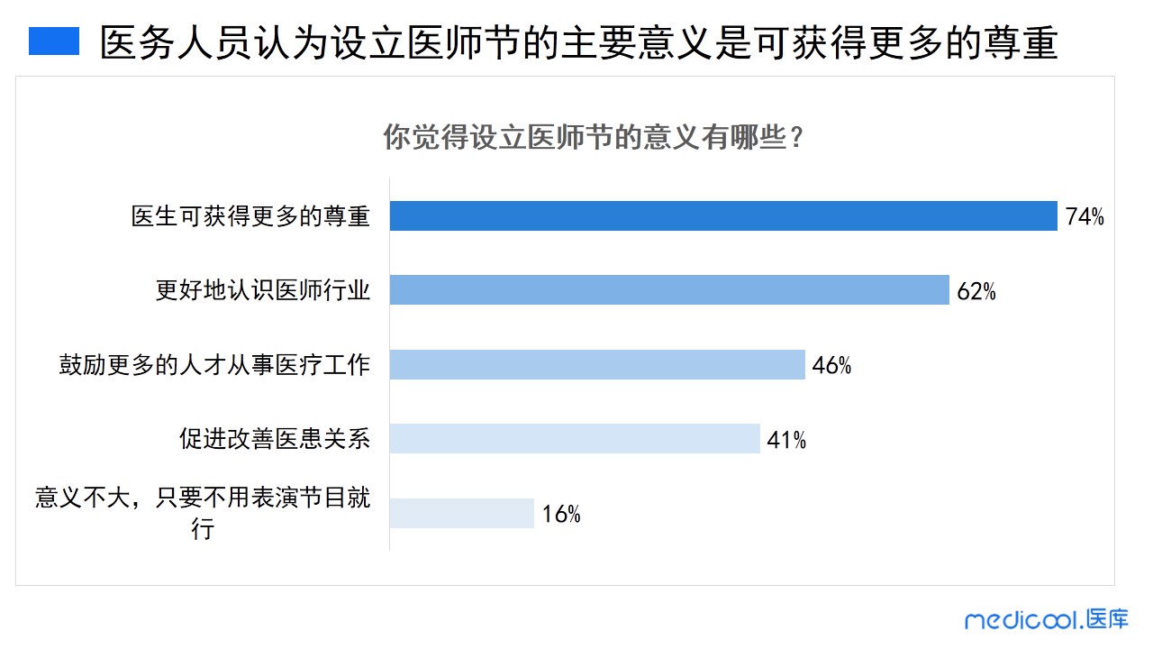 医务人员认为设立医师节的主要意义是可获得更多的尊重,其次是可让社会更多地认识医师行业,再者就是可以鼓励更多的人才从事医疗工作,同时也可以促进改善医患关系。