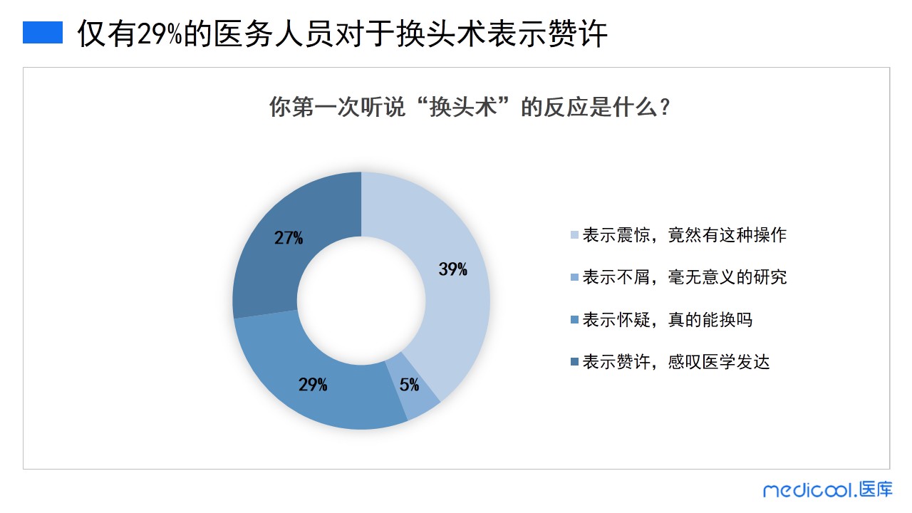 医务人员第一次听说换头术的反应是什么?在参加调研的人中,39%的医务人员表示很震惊,竟然有换头这种操作;5%的医务人员表示不屑,认为换头术是毫无意义的研究;29%的医务人员表示怀疑,不确定这是真的;27%的医务人员表示赞许,感叹医学如此发达。