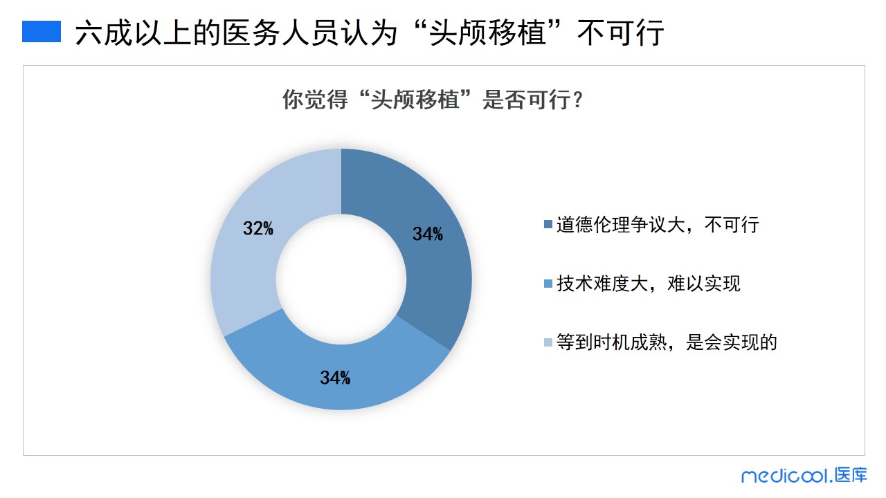 本次调研中,34%的医务人员认为头颅移植手术不可行,道德伦理争议大;34%的医务人员认为这个手术技术难度太大,难以实现;32%的医务人员还是很乐观的,等到时机成熟,头颅移植最终是会实现的。