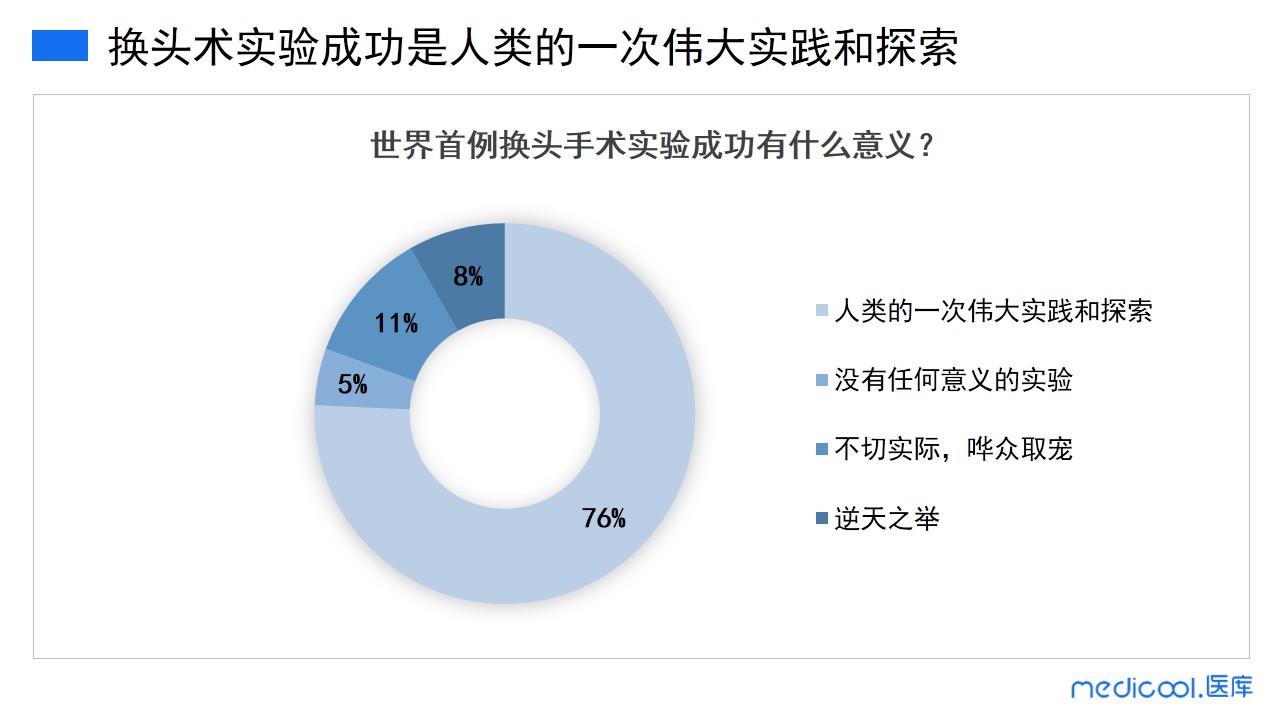 从我们的调研数据可以看到,76%的医务人员认为这是人类一次伟大的实践和探索;5%的医务人员认为这是没有任何意义的实验;11%的医务人员认为这是不切合实际的实验,只是哗众取宠;8%的医务人员认为这是逆天之举。