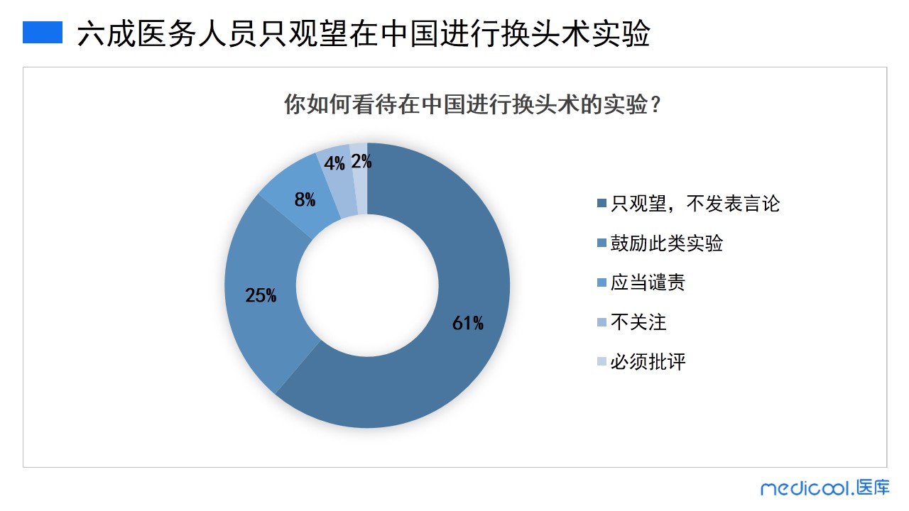 在中国进行换头术实验,61%的医务人员不想发表任何言论,只观望;25%的医务人员鼓励在中国进行这类实验;8%的医务人员认为应当谴责在中国进行换头术实验;4%的医务人员不关注这个实验;2%的医务人员认为必须批评此类实验在中国进行。