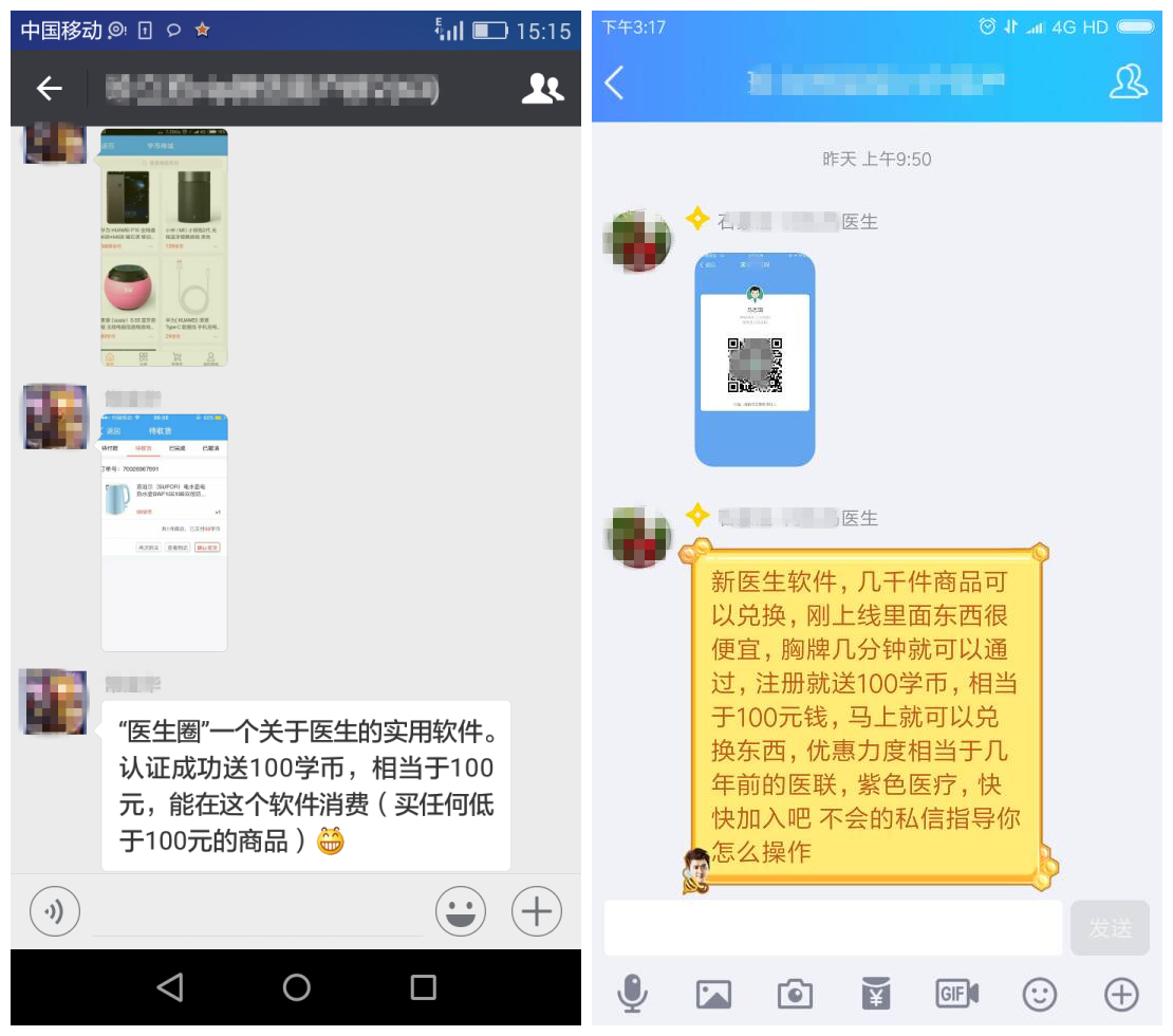 我们大概在三四个月之前就注意到康哲药业关联投资的医生圈在开始做推广活动,随后在这一个月达到了高潮,各大医生微信群、QQ群无所不用其极的发出广告,多种文案提到上来一个医生就给100元代币奖励,其次是用户每邀请一个医生可以获得20元到xxx不等的奖励。