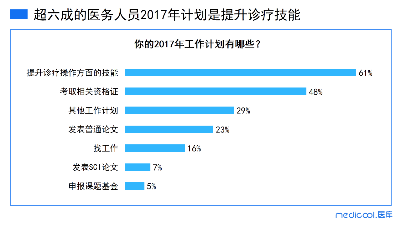 在谈到2017年医务人员有哪些工作计划时,医务人员更倾向于计划提升诊疗操作方面的技能,其次则是计划考取相关资格证,再者就是计划发表论文、找工作、申报课题基金等,另外还有29%的人有其他方面的工作计划,可以看出医务人员平时的学习生活充实而忙碌。