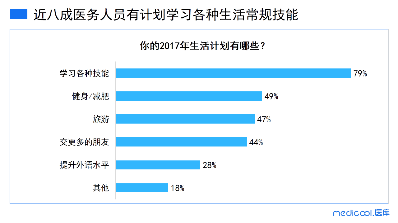 在参加调研的医务人员中,79%的医务人员计划学习各种技能,如烹饪、游泳、跳舞等;49%的医务人员计划健身或者减肥;47%的医务人员有去旅游的计划;44%的医务人员计划交更多的朋友;28%的医务人员有提升外语水平的计划。