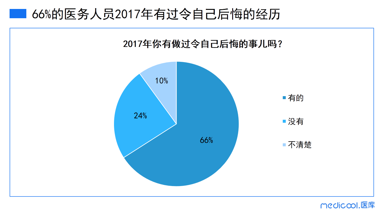 由调研数据显示,66%的医务人员表示有过后悔的经历,24%的医务人员没做过另自己悔恨的事,10%的医务人员表示不清楚自己是否做过后悔的事情。