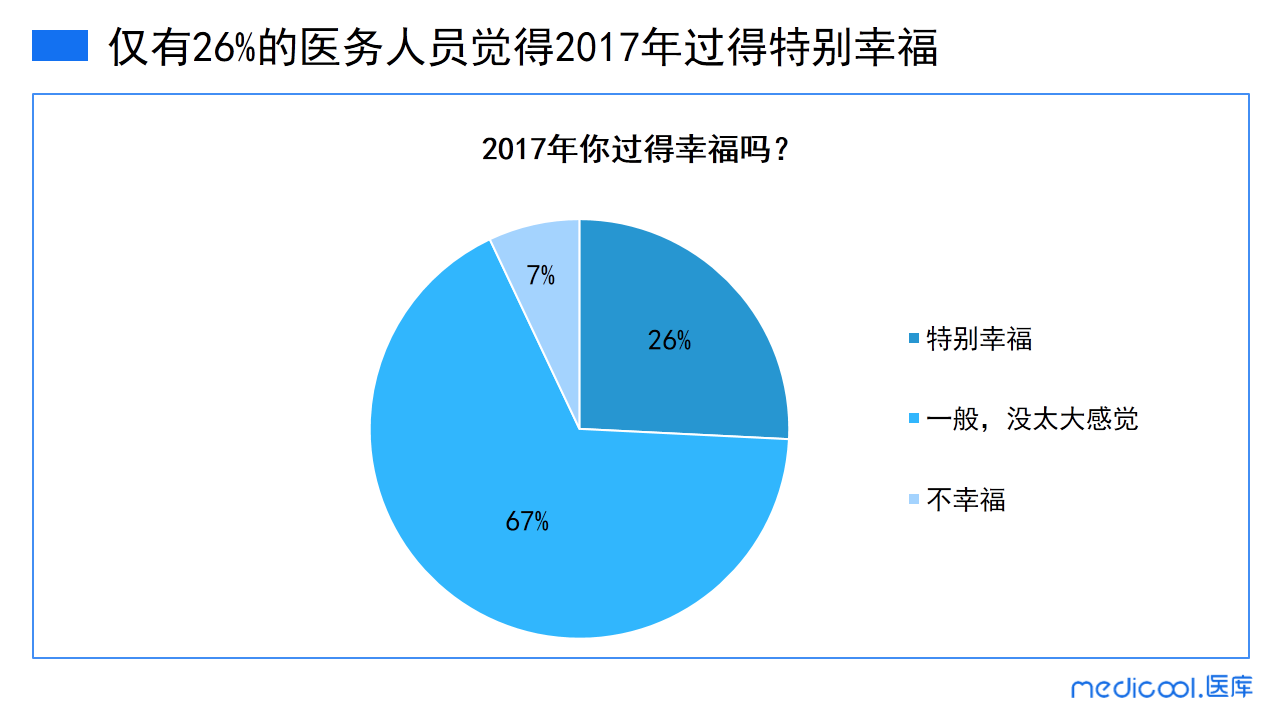2017年医务人员过得幸福吗?从调研数据得知,26%的医务人员表示自己的2017年是特别幸福地度过的;67%的医务人员表示一般,没太大的感觉;另外有7%的医务人员表示自己的2017年过得并不幸福。