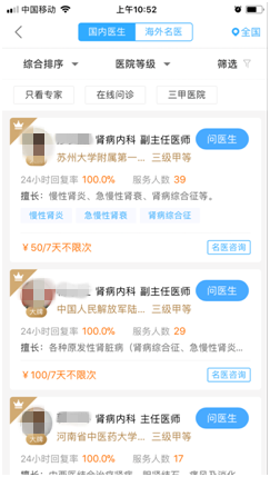 ④科室:分为国内国外,可以选择地区、医院等级、按条件筛选等方式选择医生。
