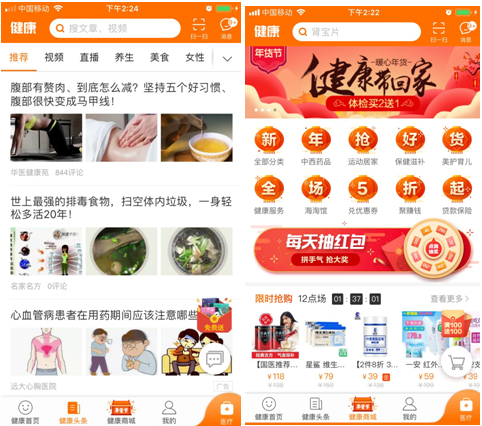 包括健康首页、健康头条、健康商城三大版块。
