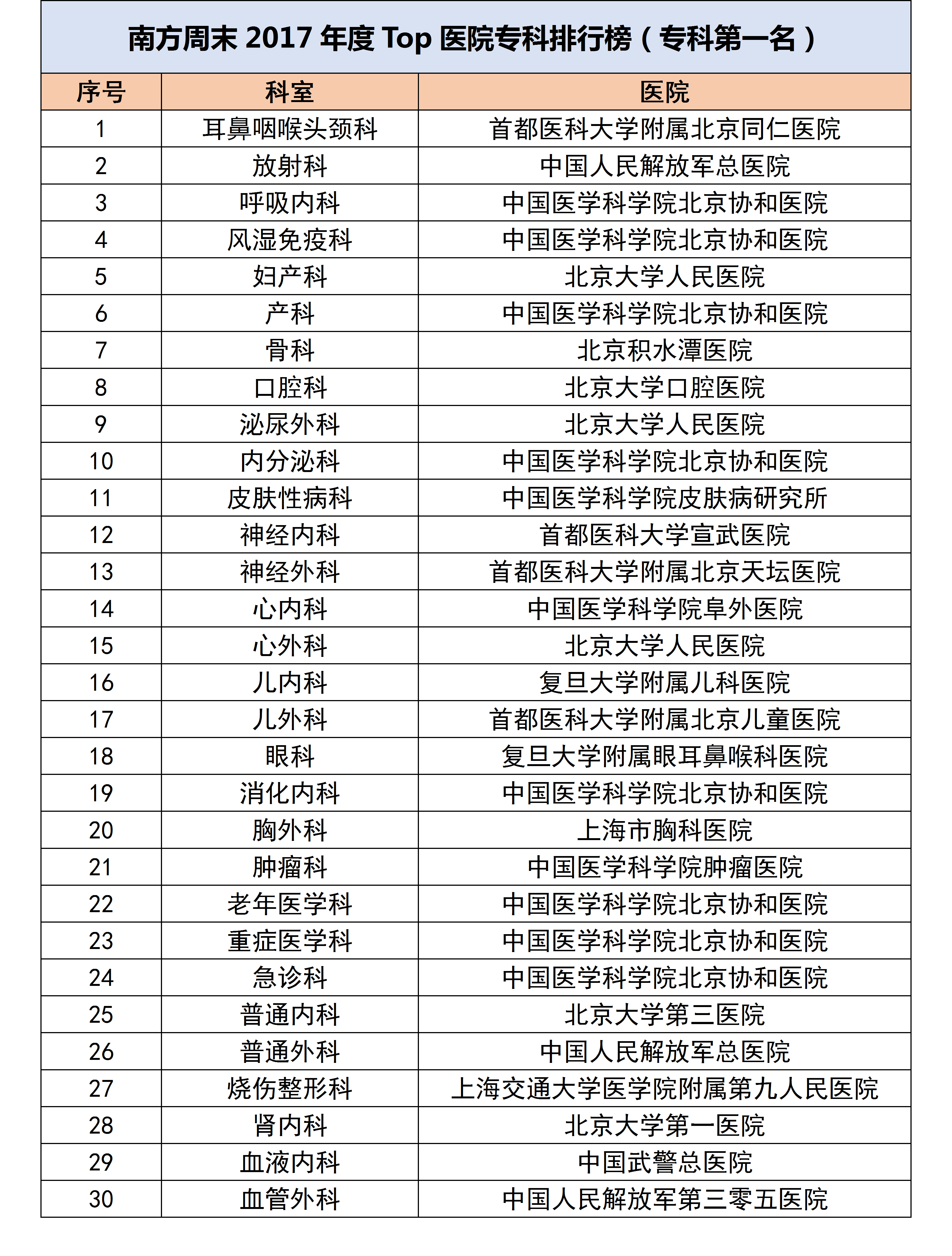 南方周末2017年度Top医院专科排行榜(专科第一名汇总):