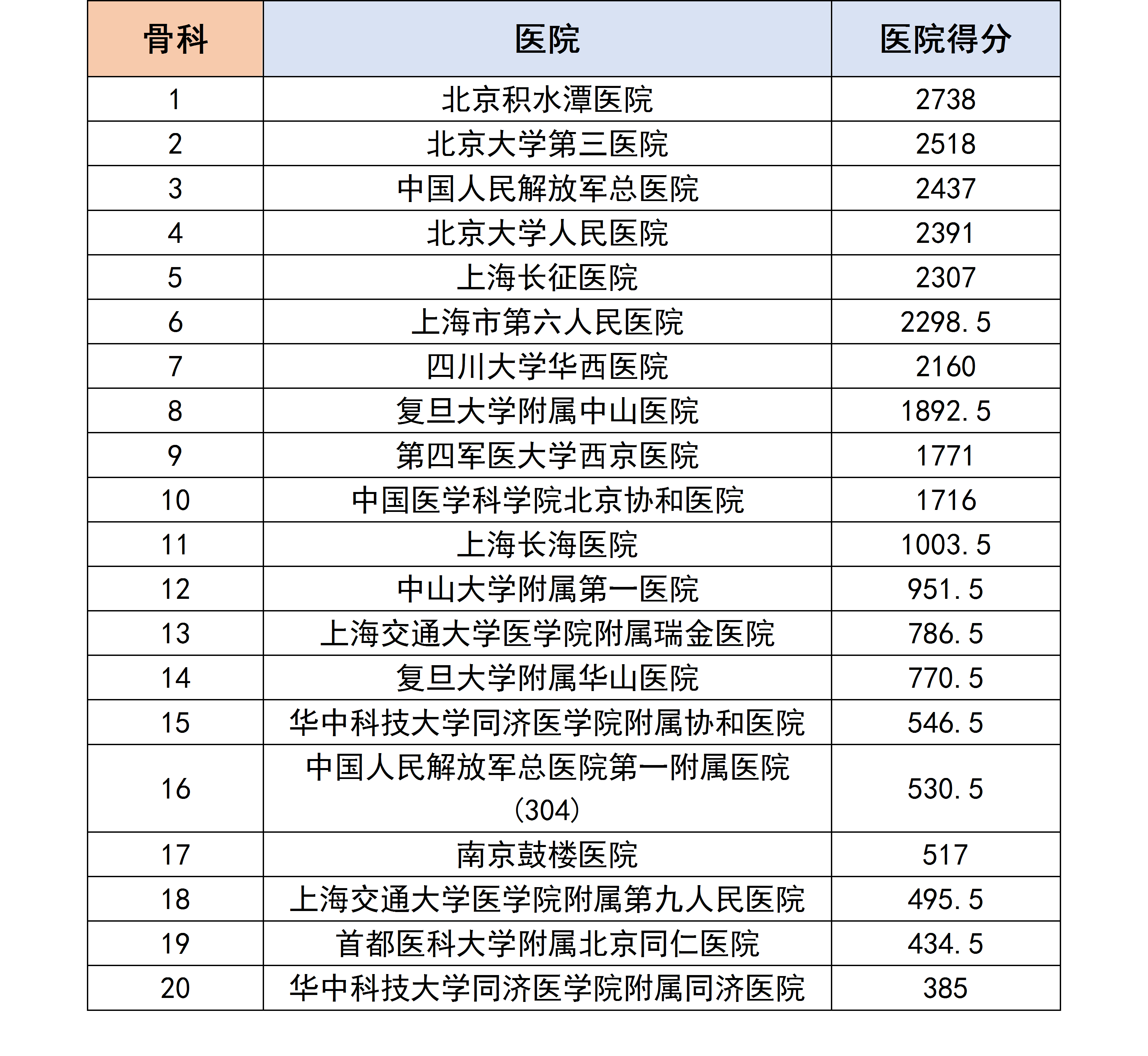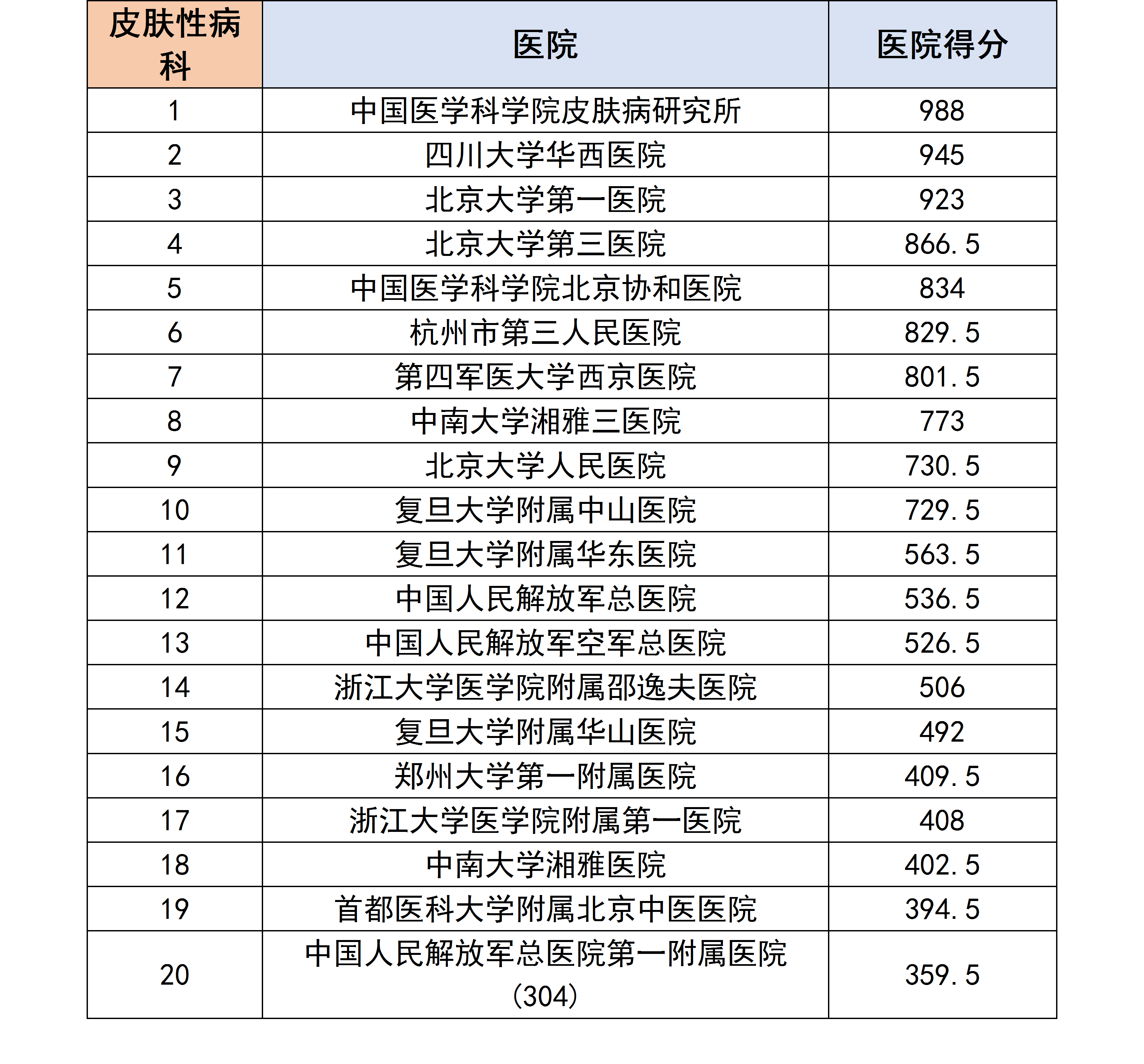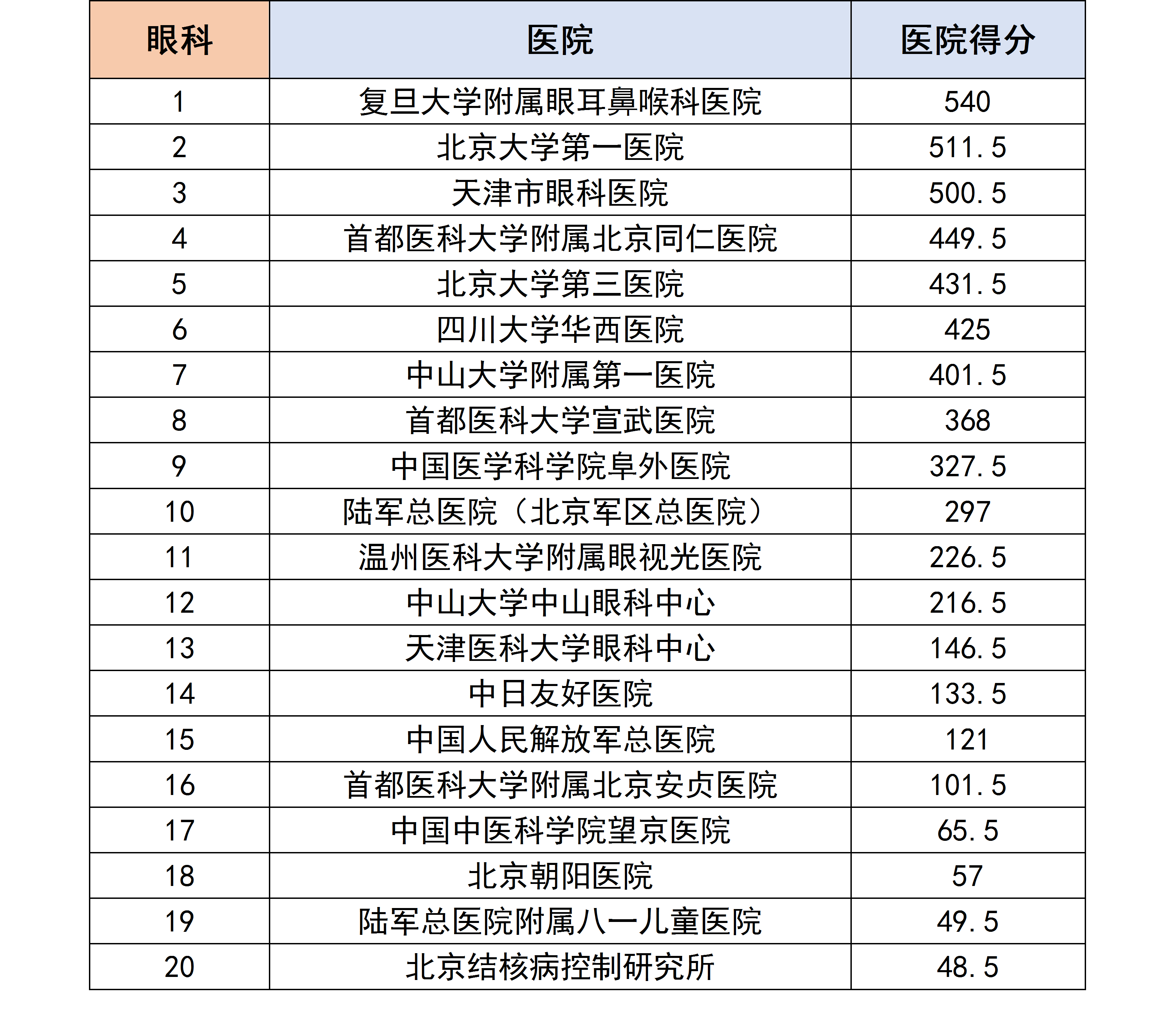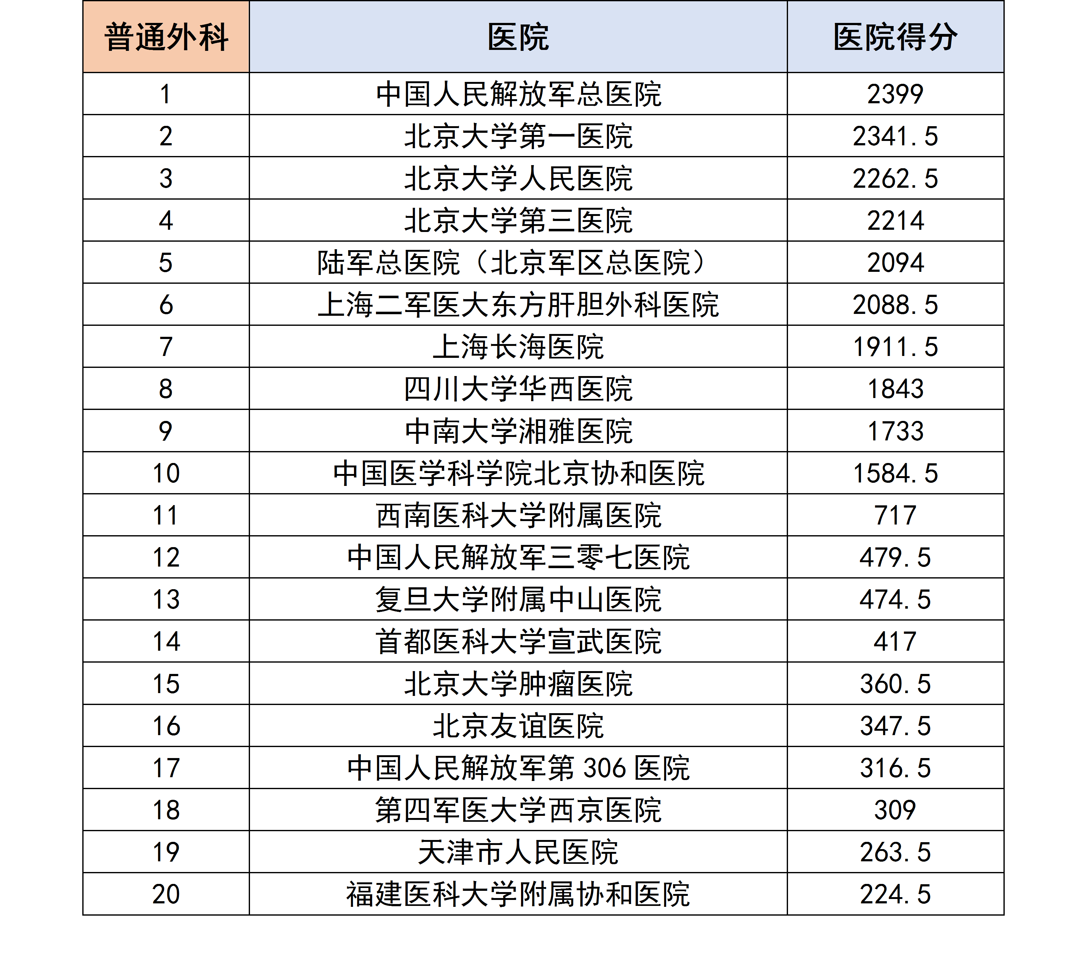 各个专科下的医院进行分数统计后,获得了以下各个分科室的专科排行榜。
