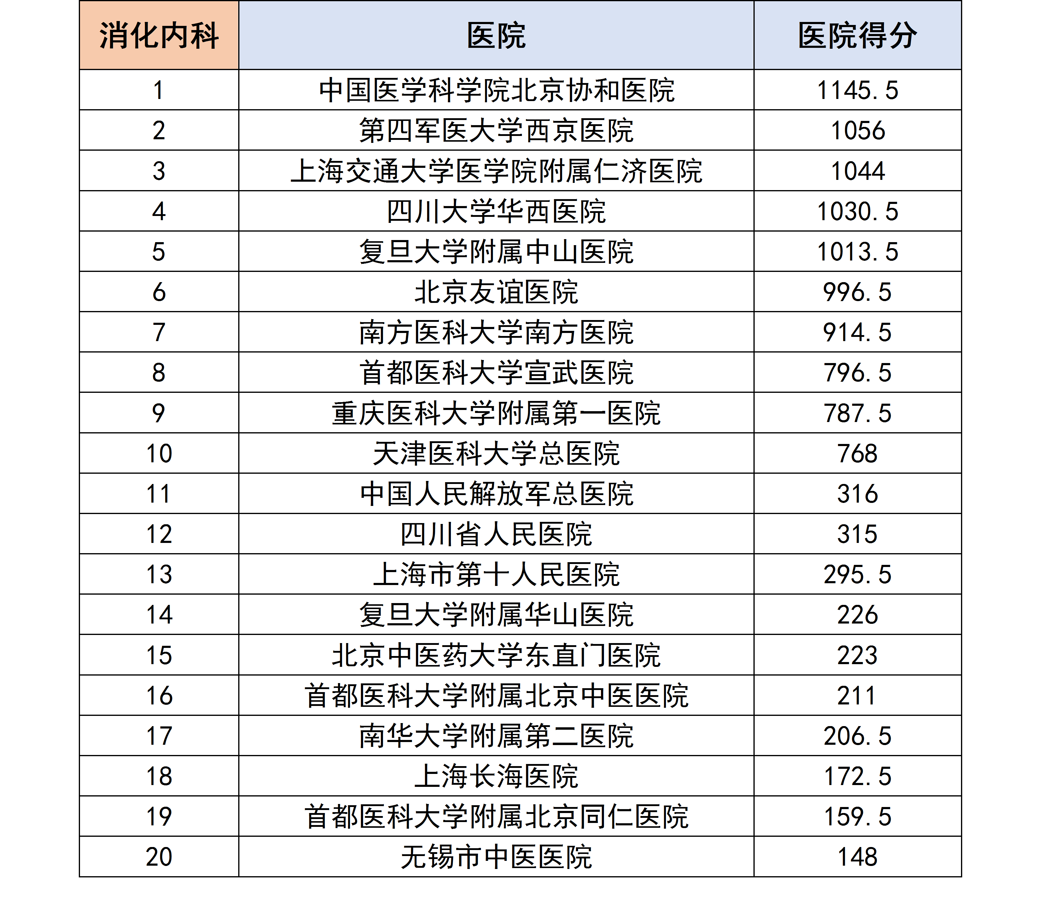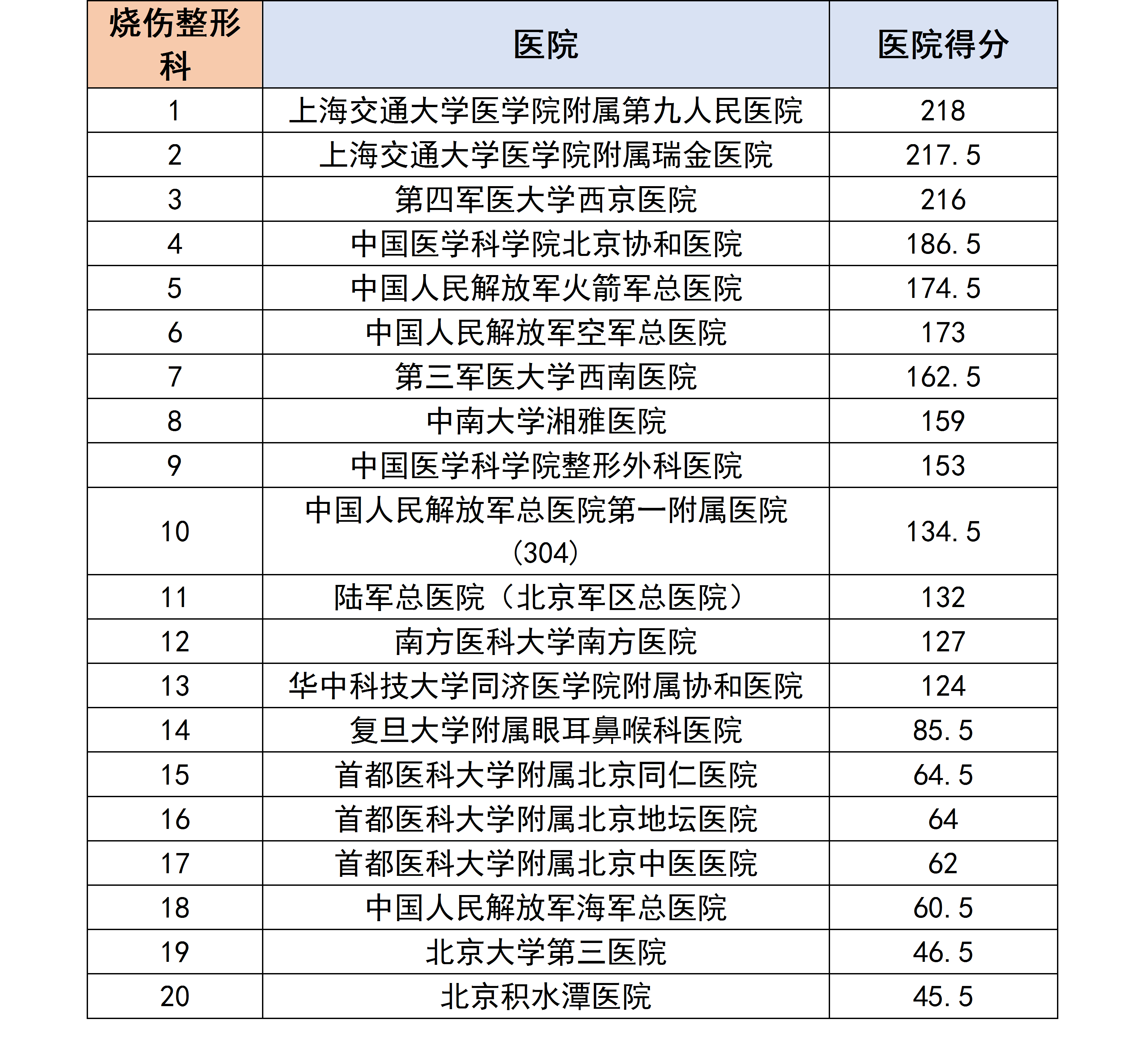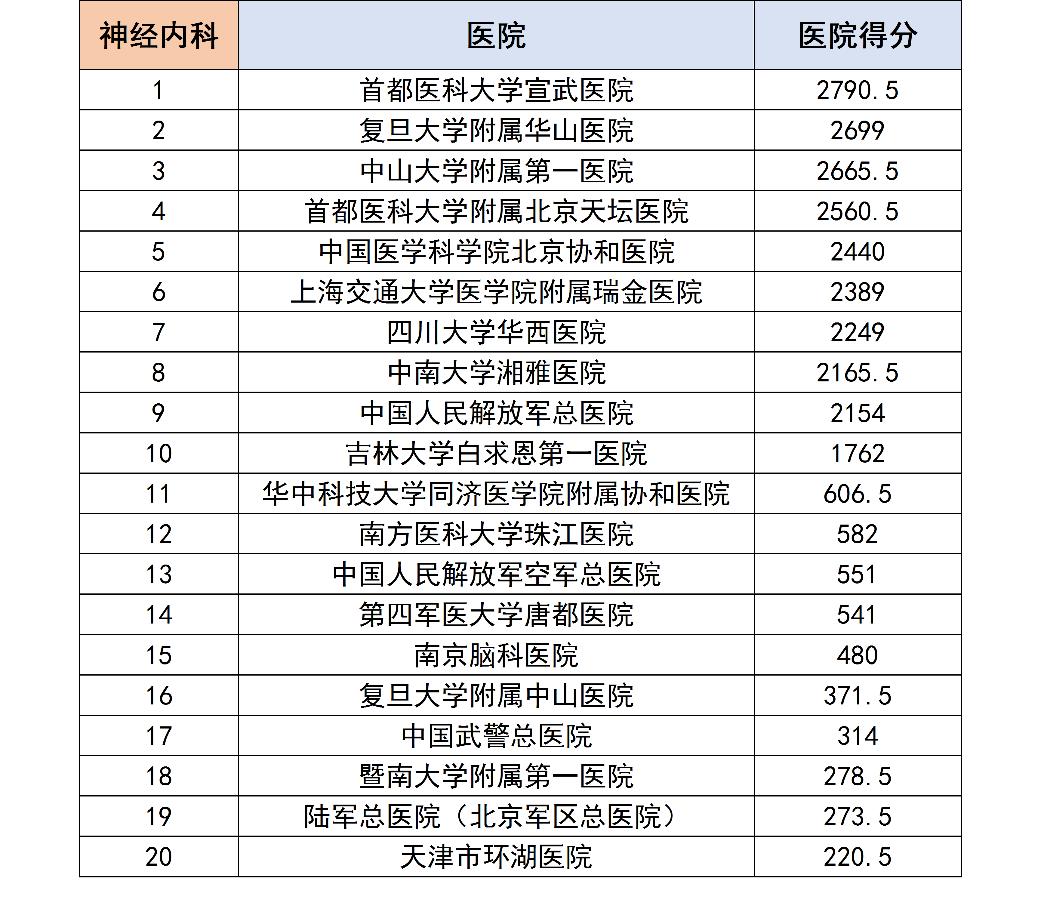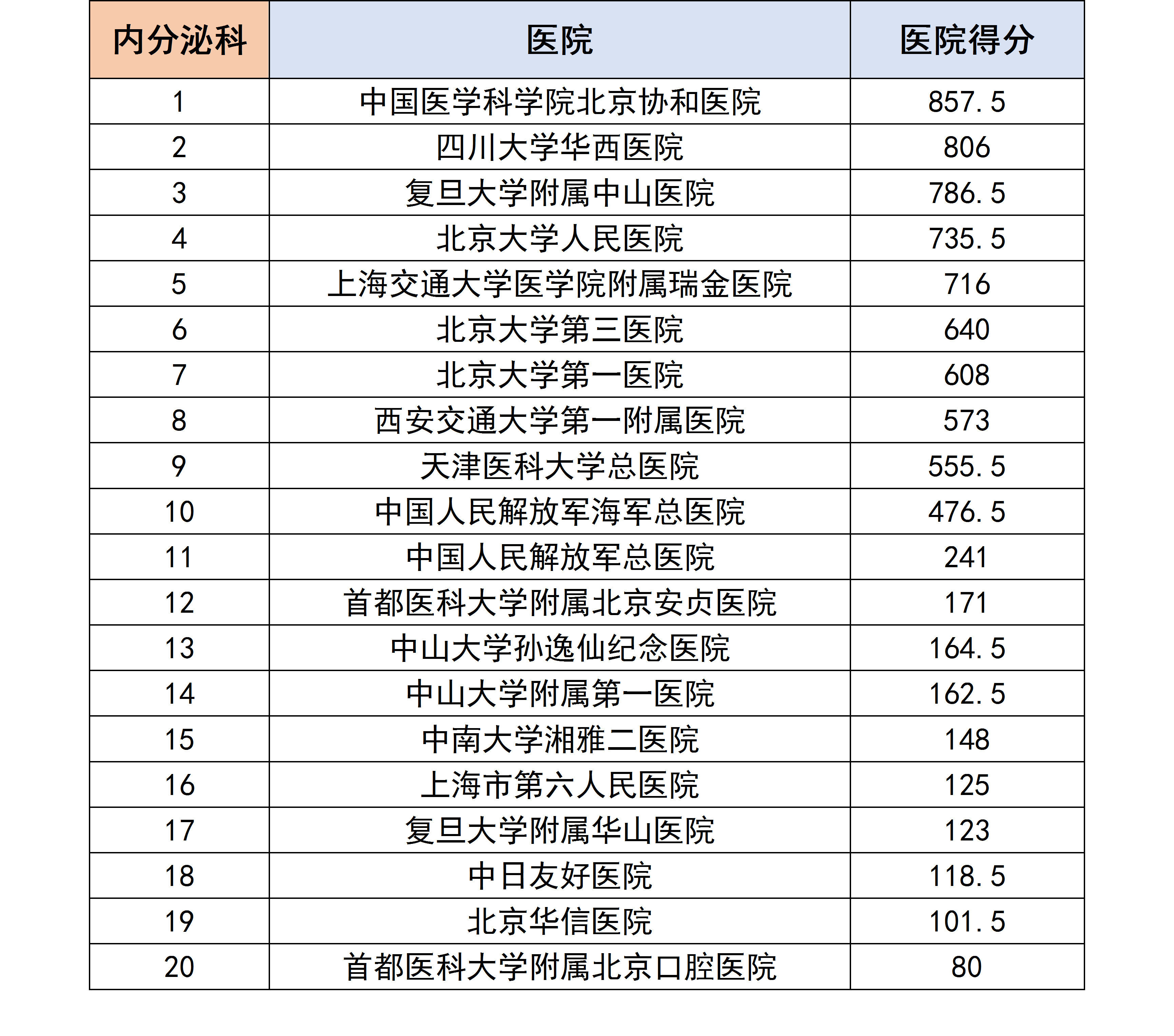 各个专科下的医院进行分数统计后,获得了以下各个分科室的专科排行榜。