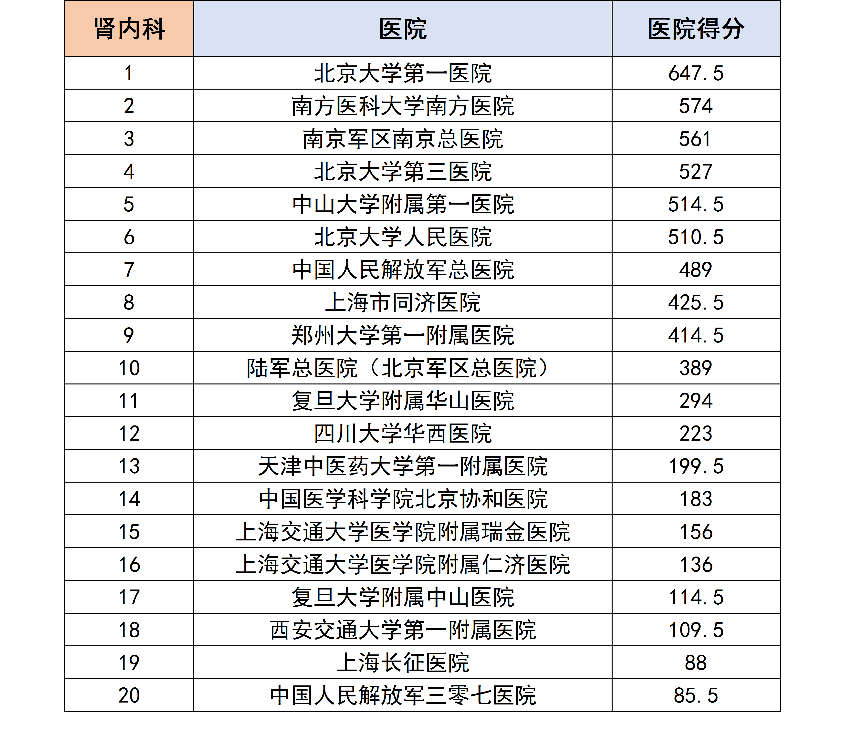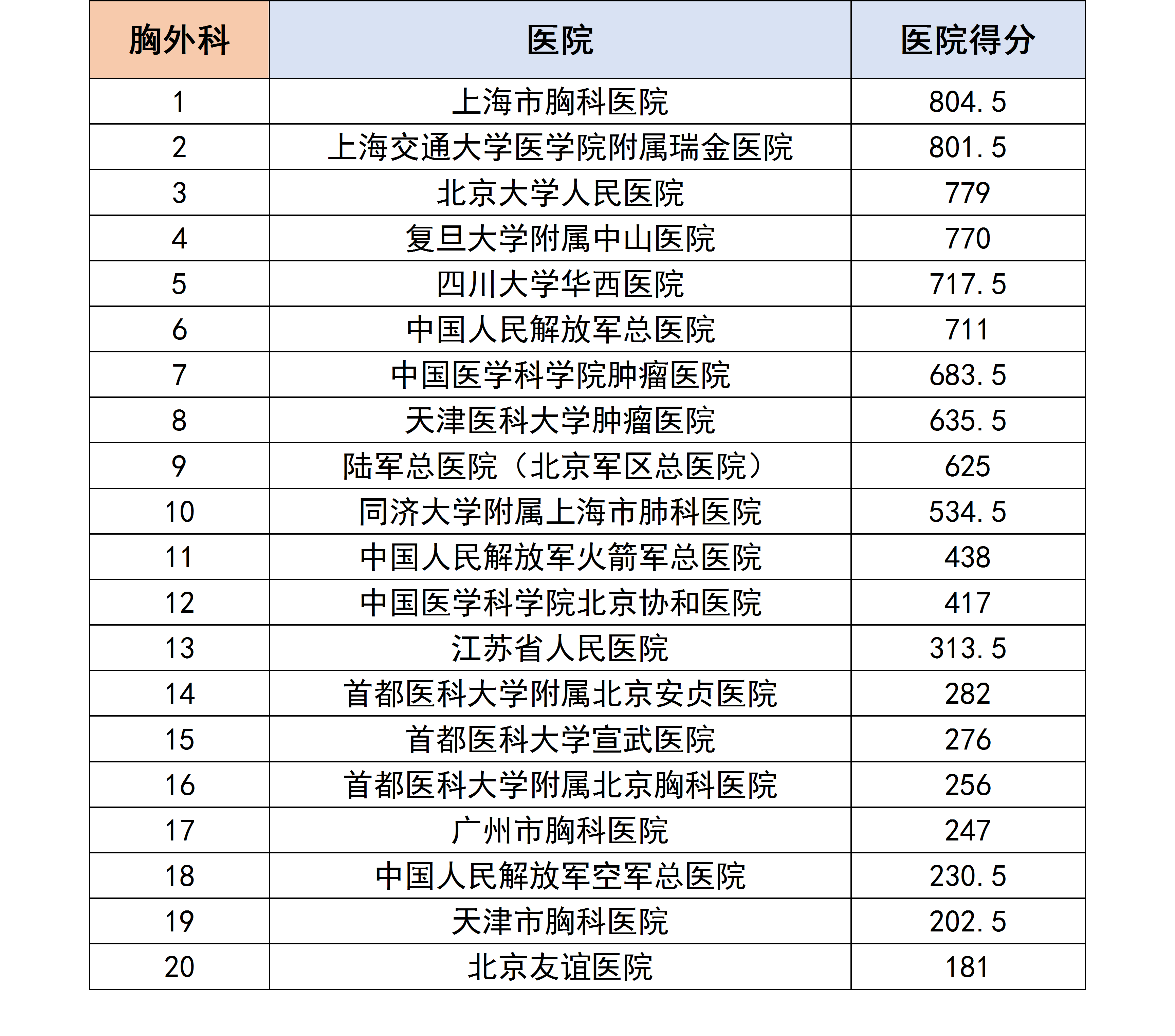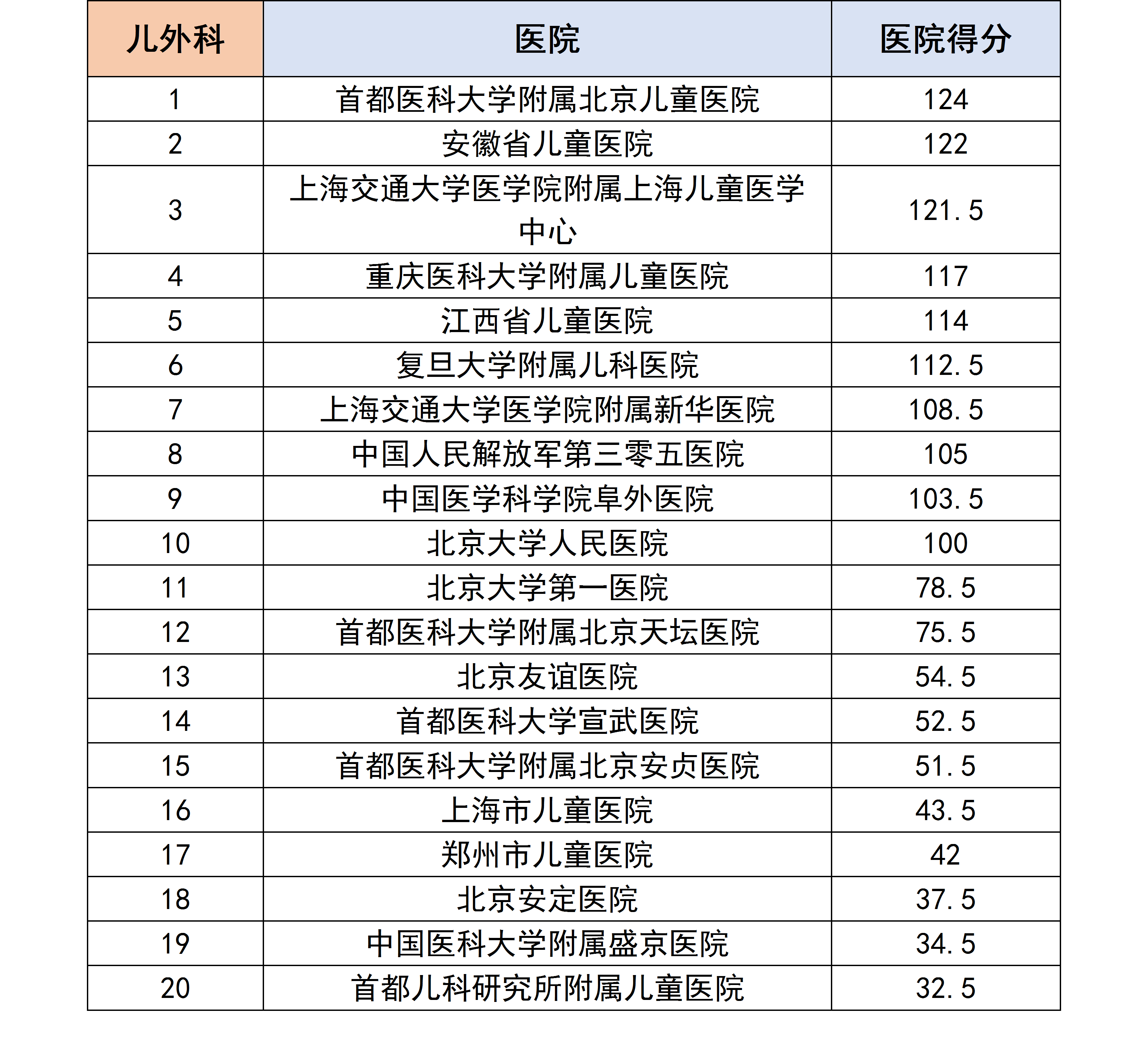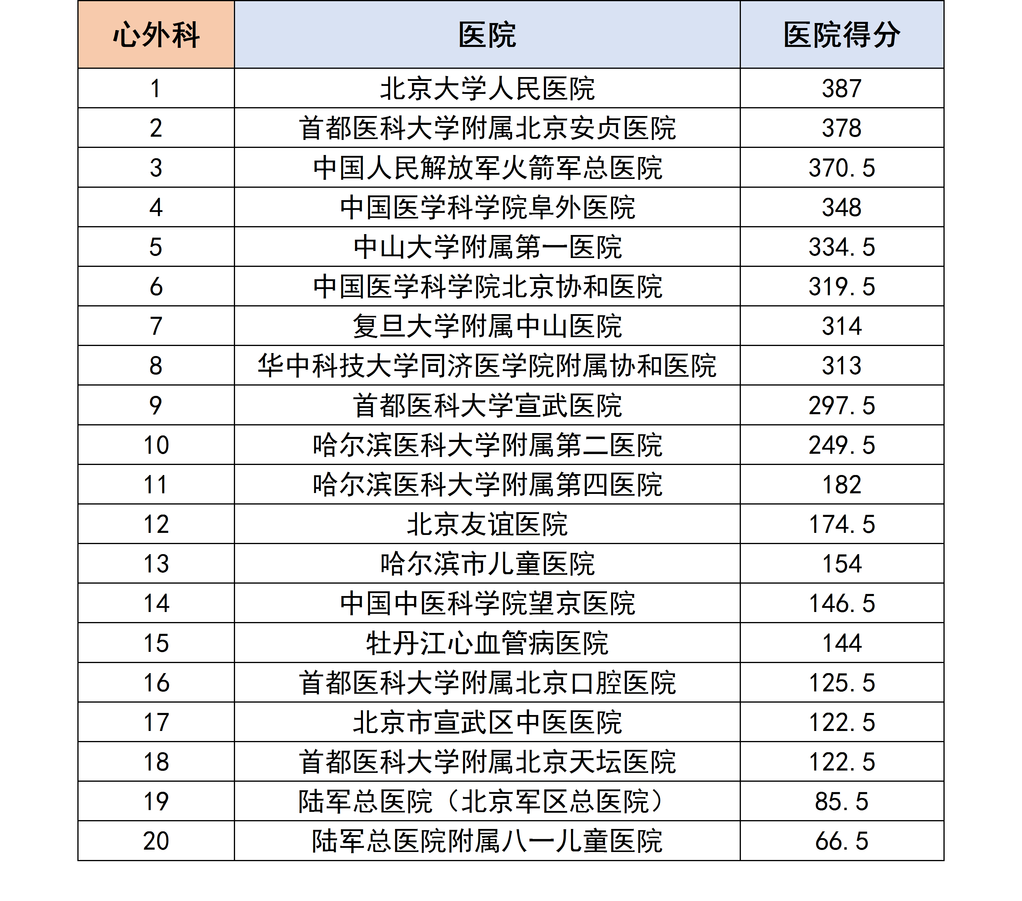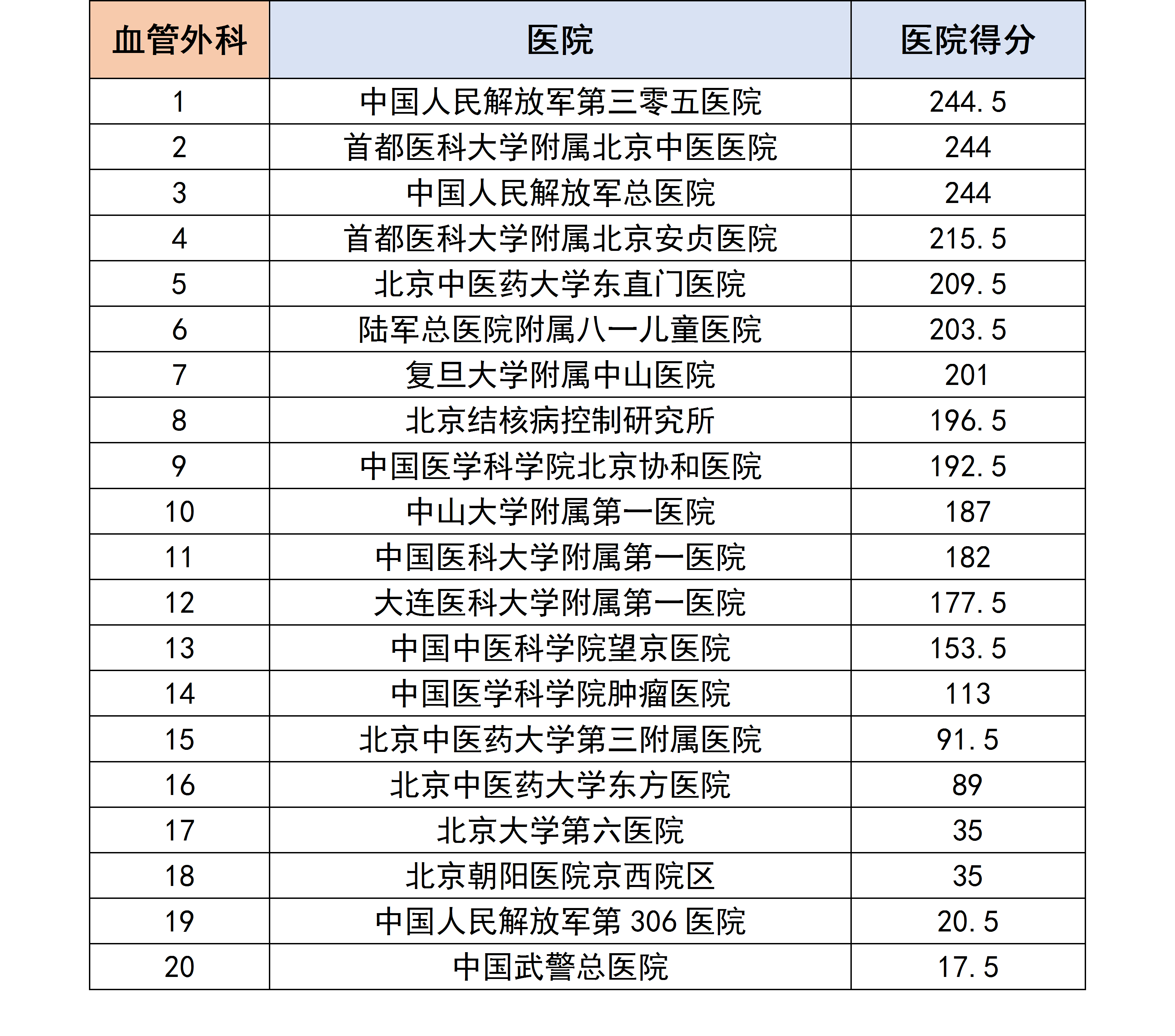 各个专科下的医院进行分数统计后,获得了以下各个分科室的专科排行榜。