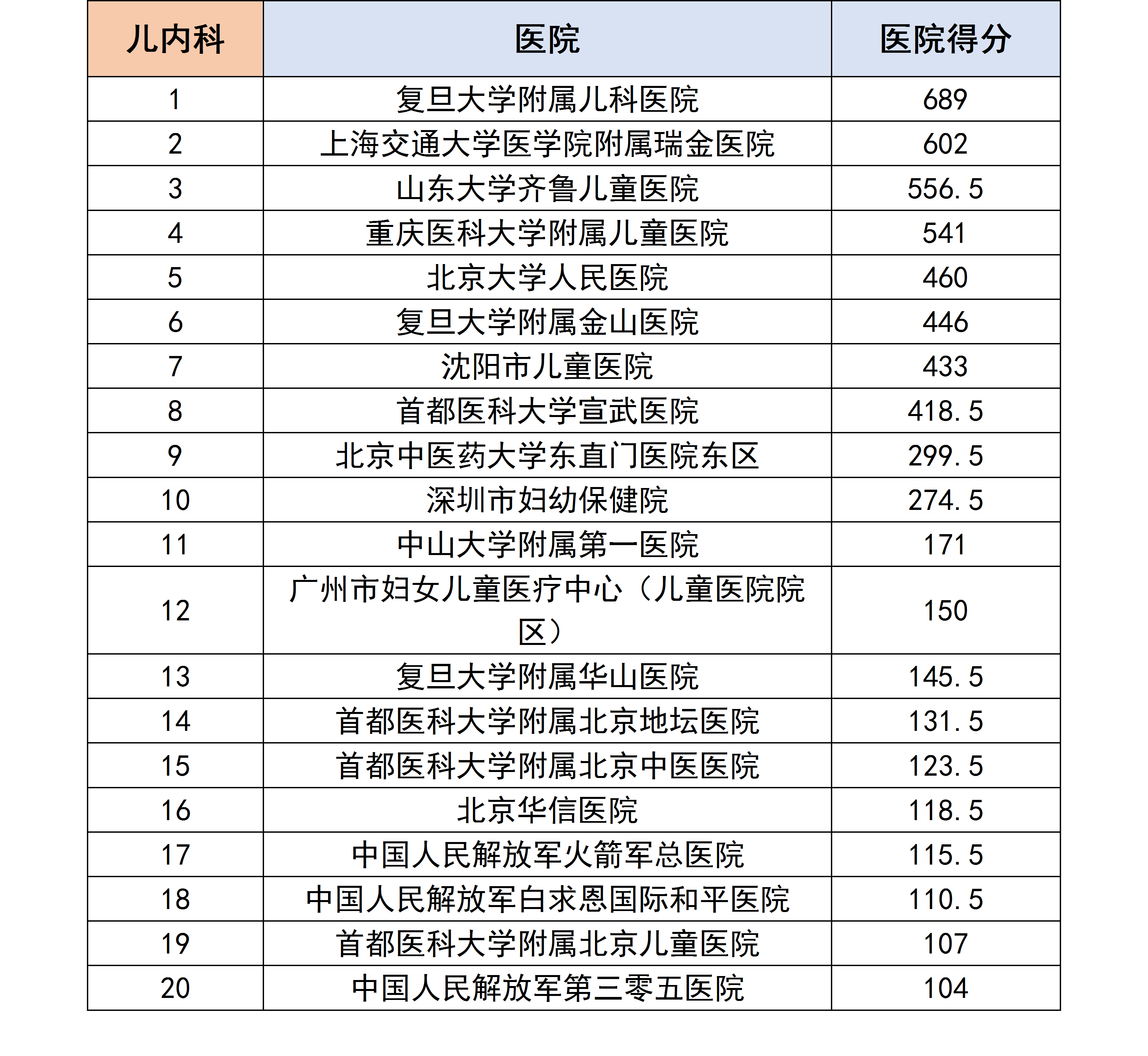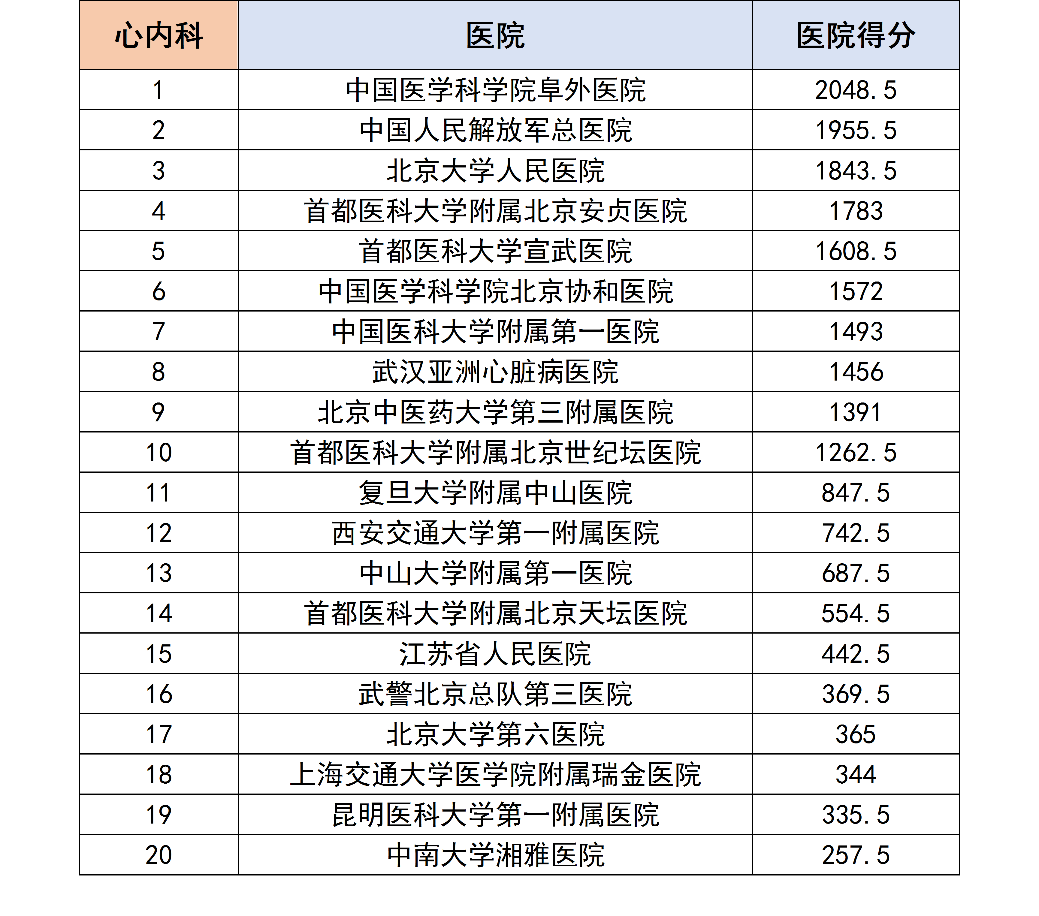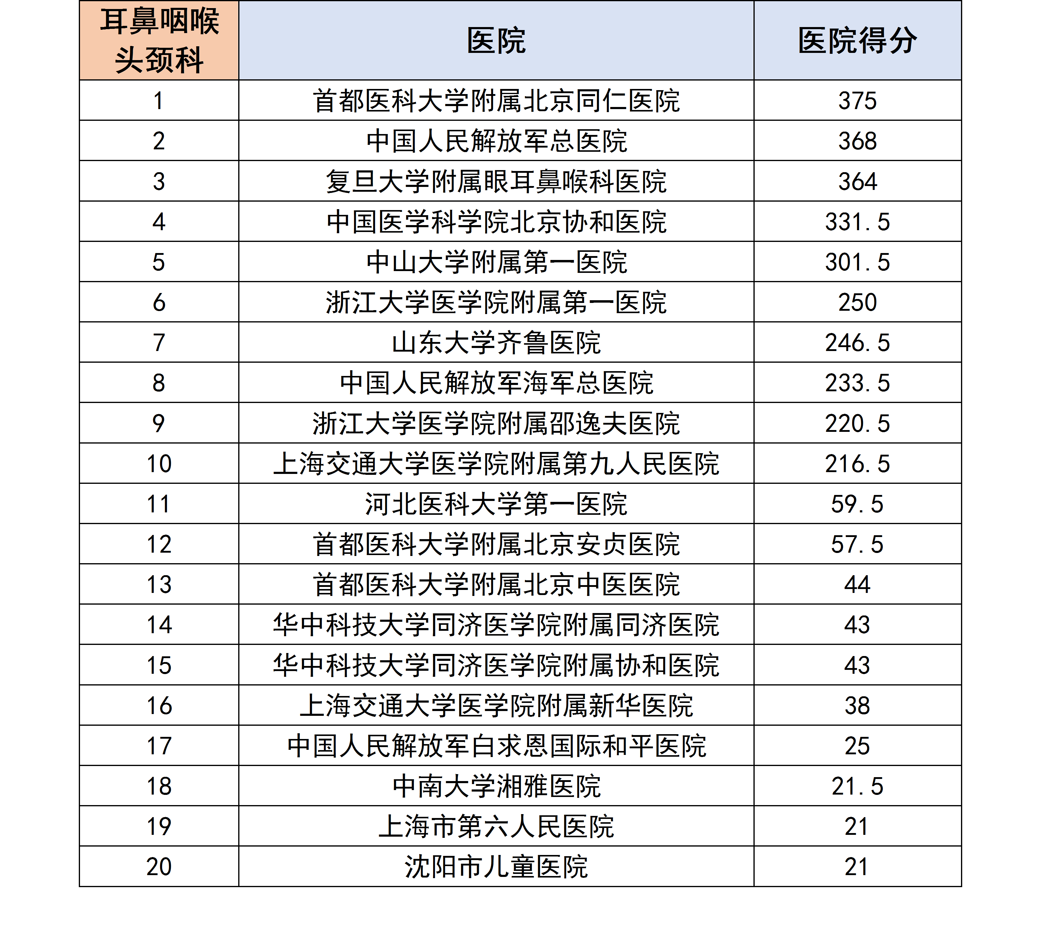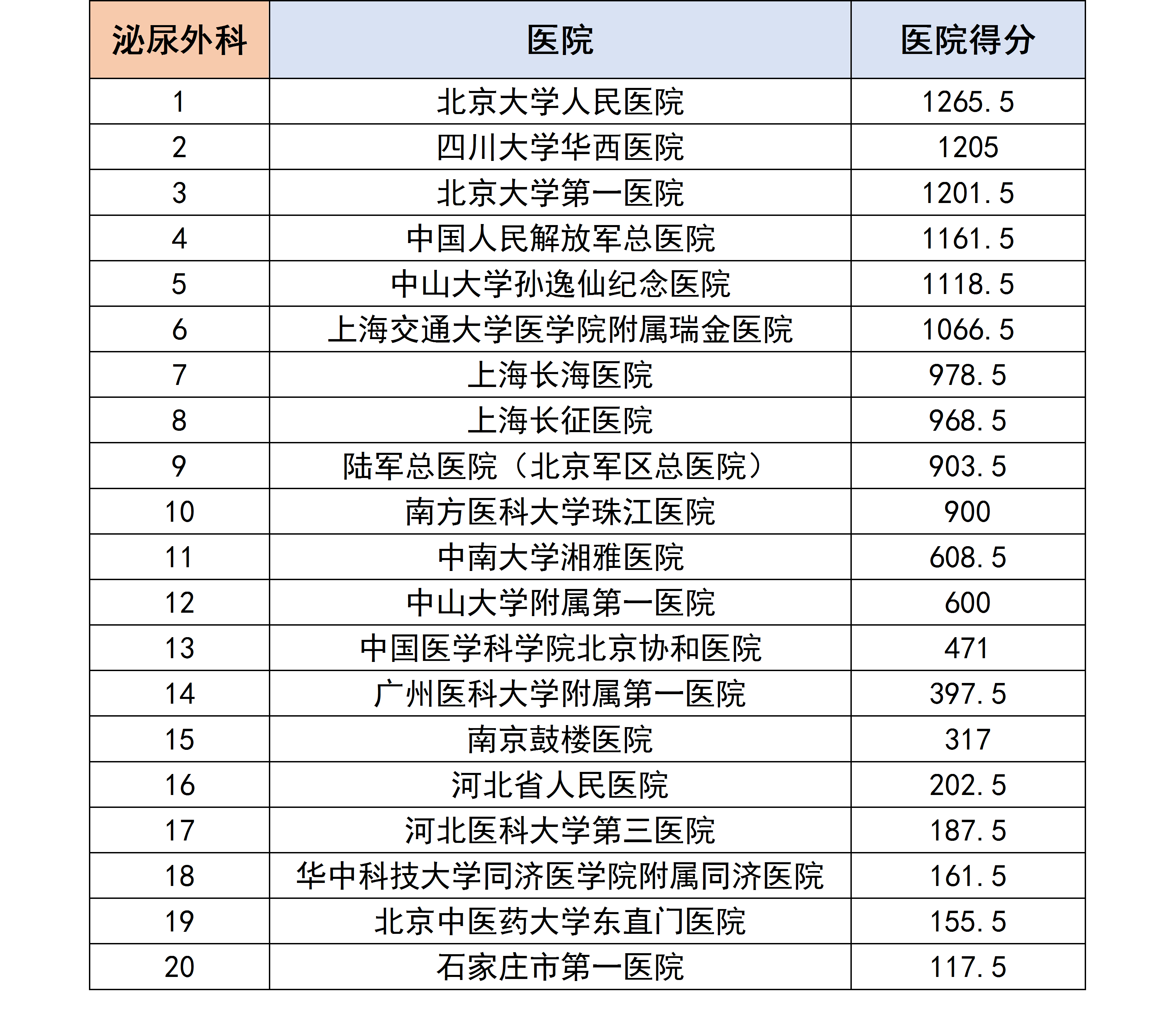 各个专科下的医院进行分数统计后,获得了以下各个分科室的专科排行榜。