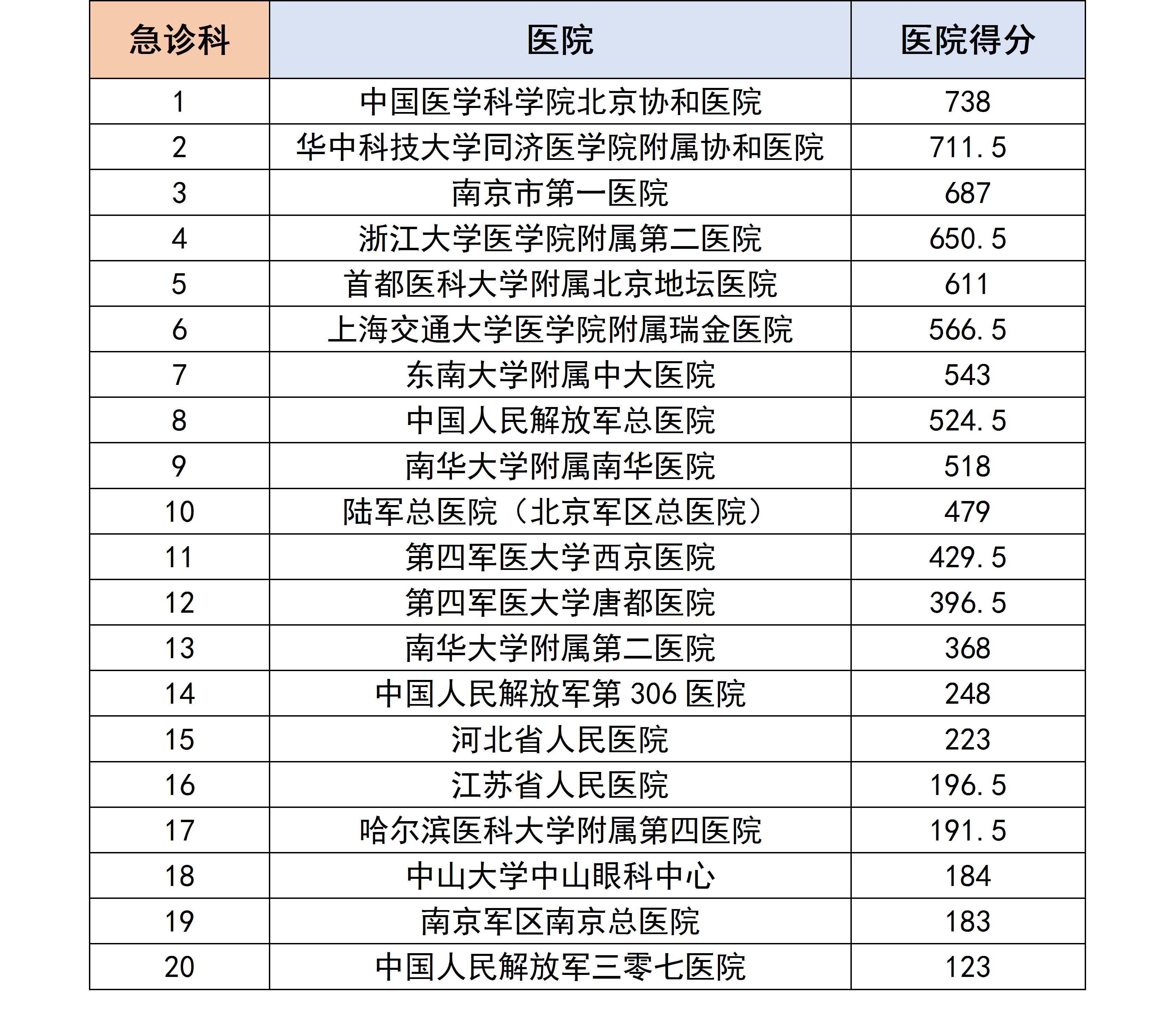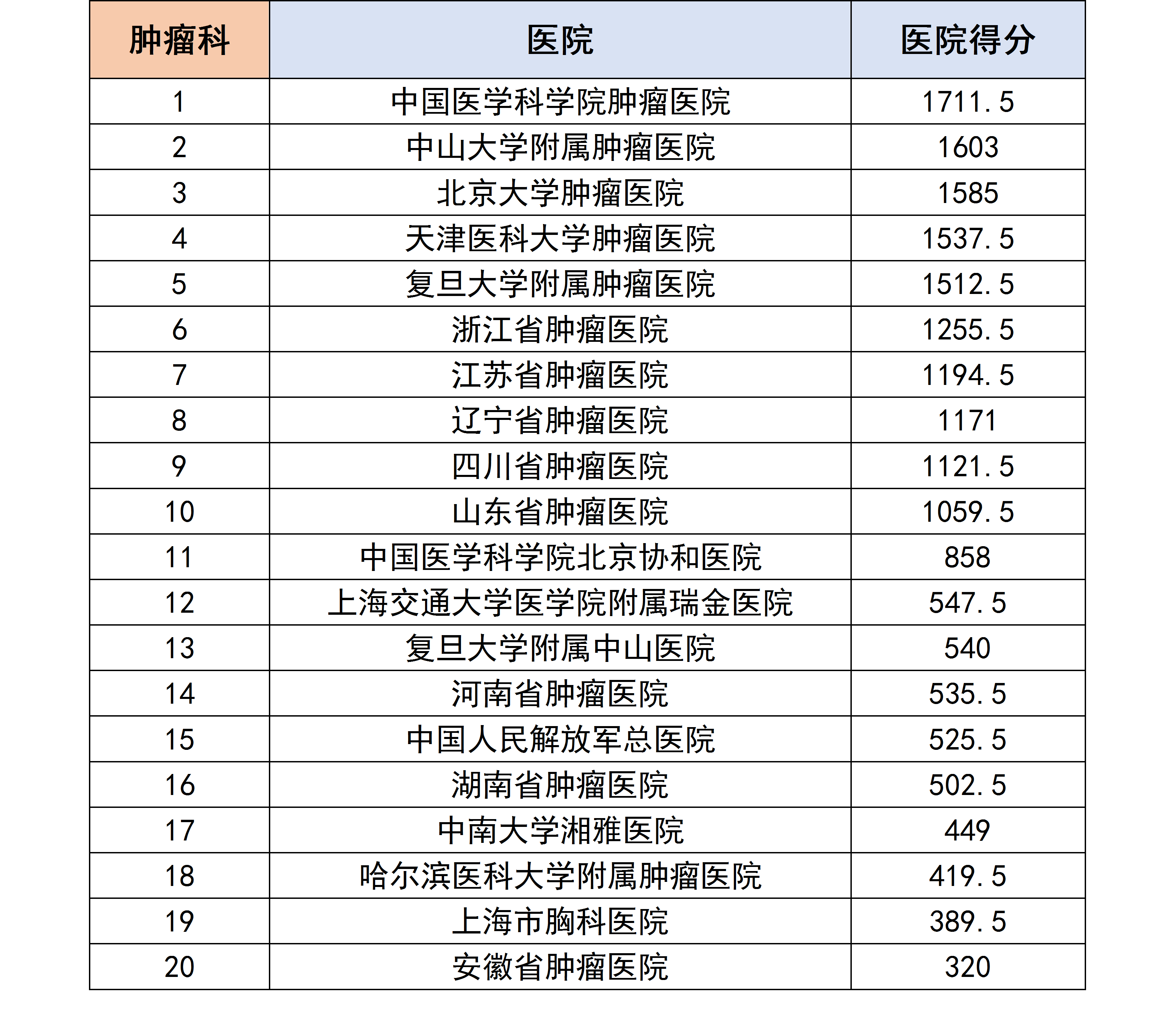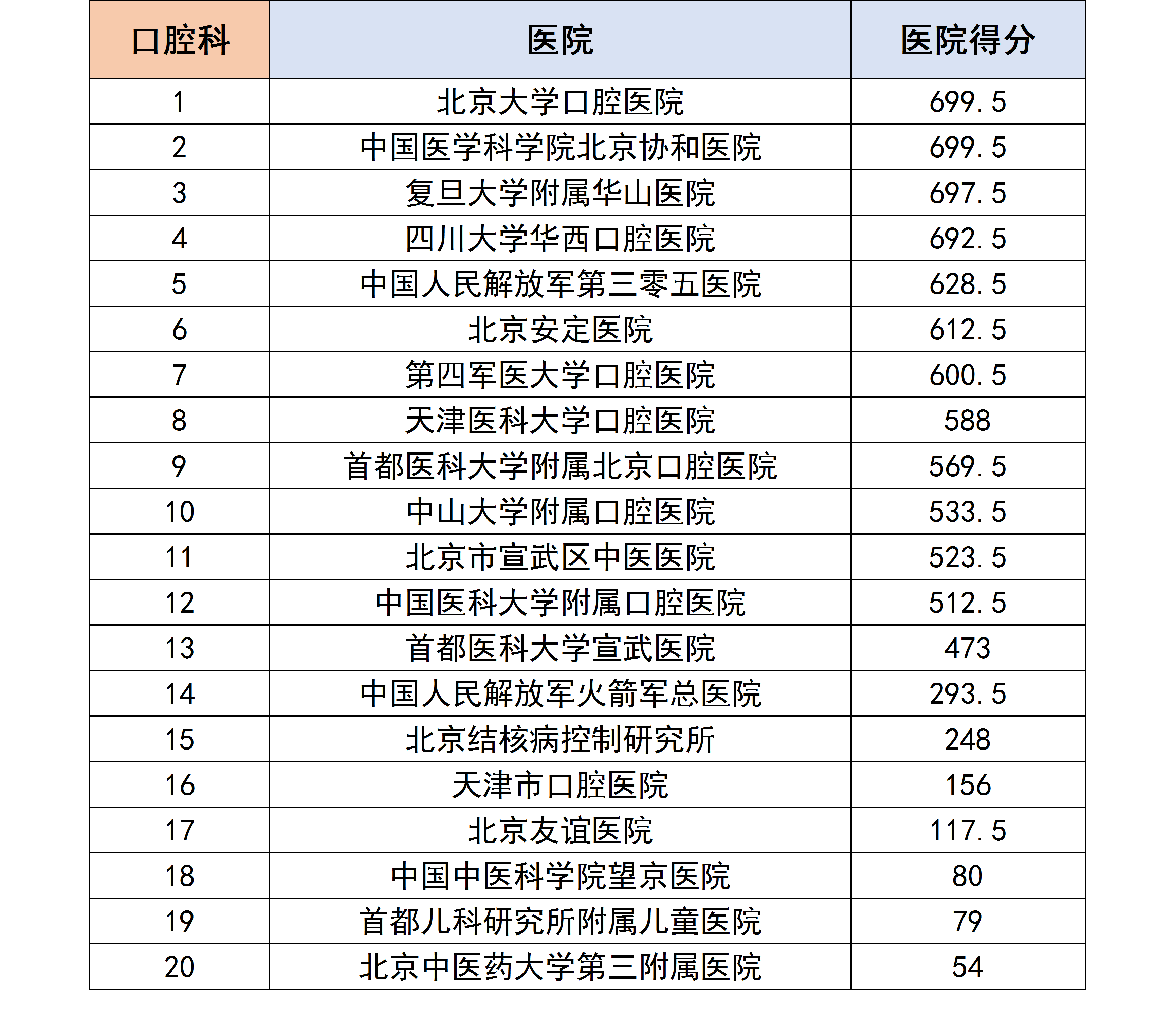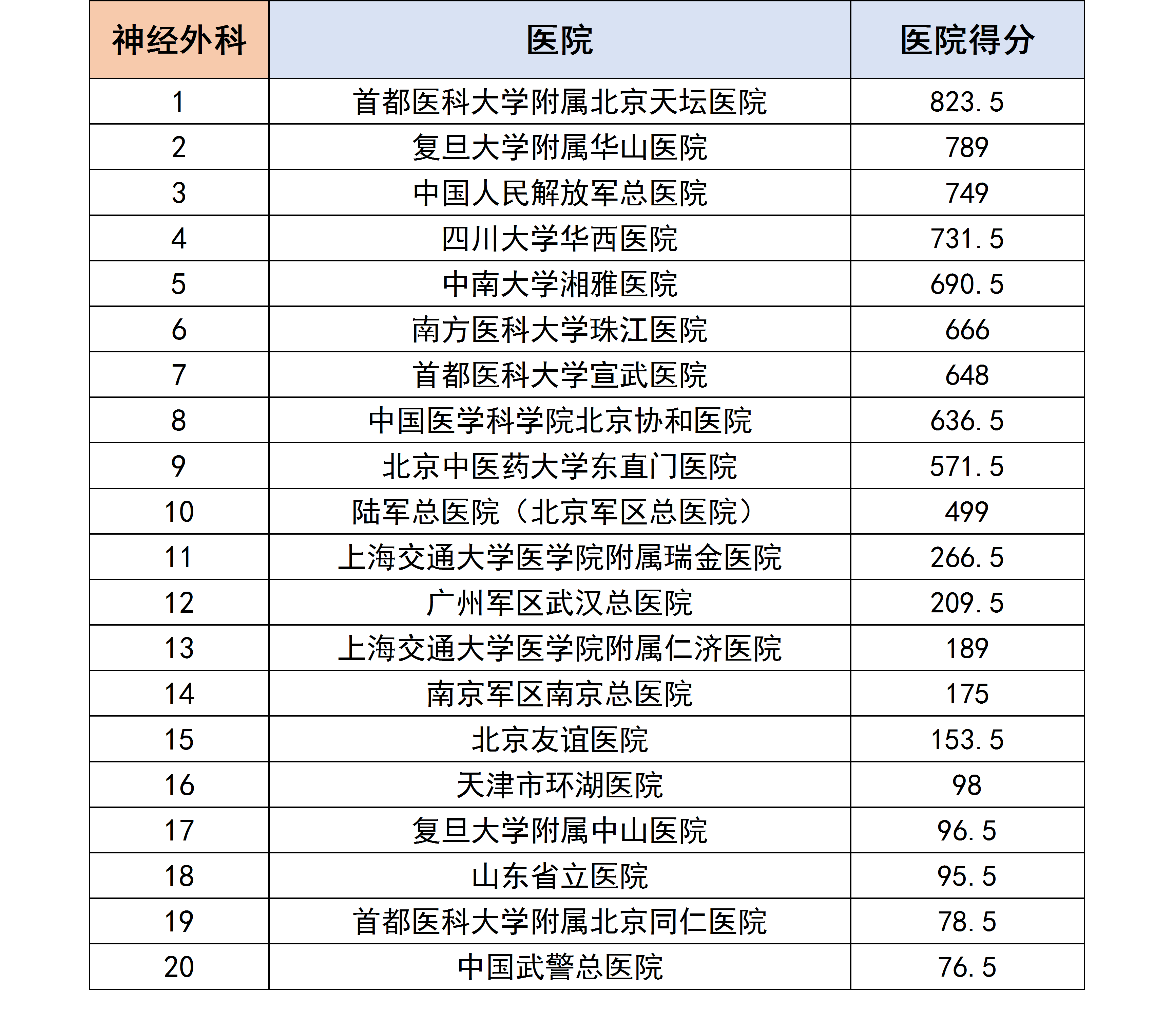 各个专科下的医院进行分数统计后,获得了以下各个分科室的专科排行榜。
