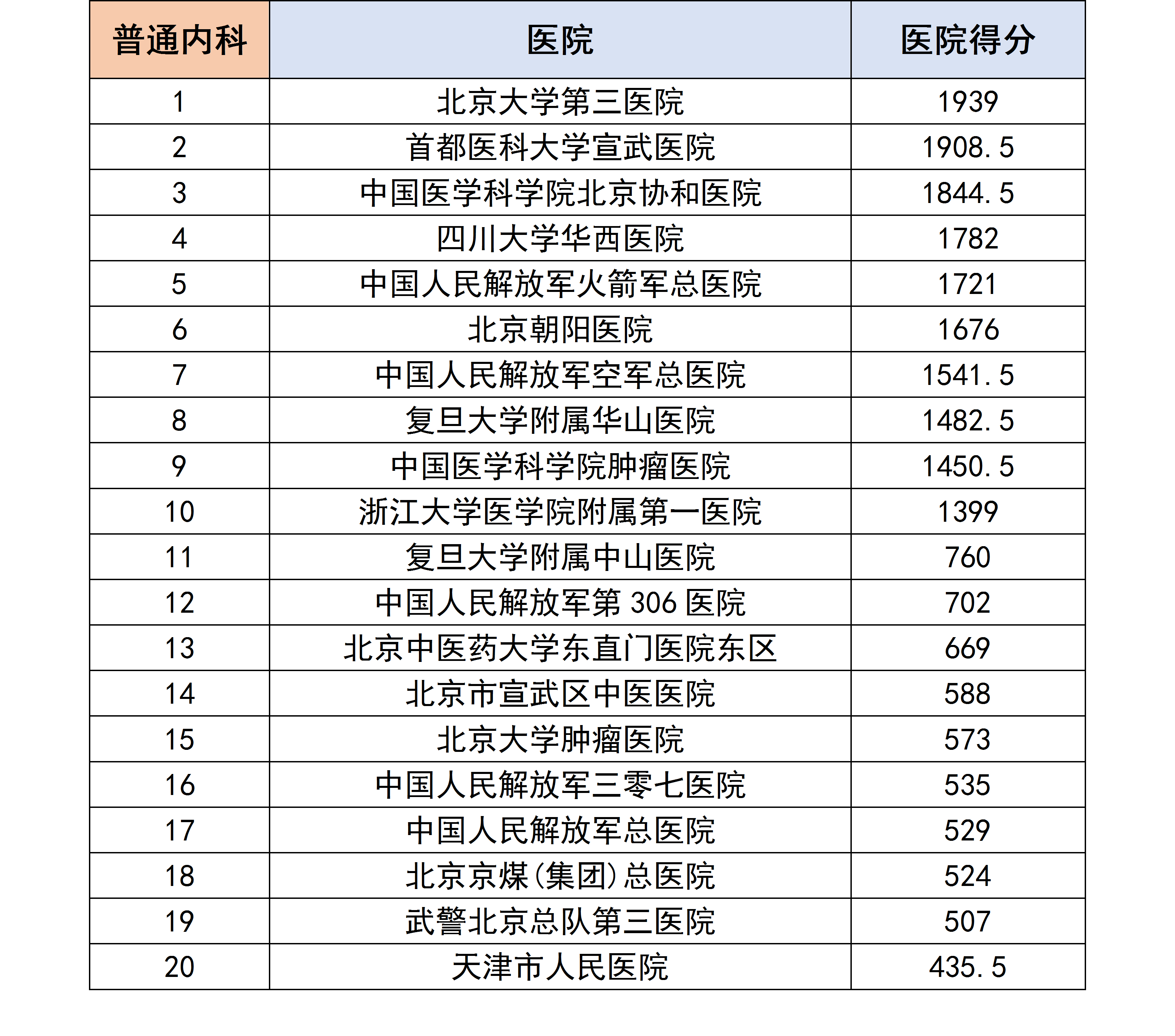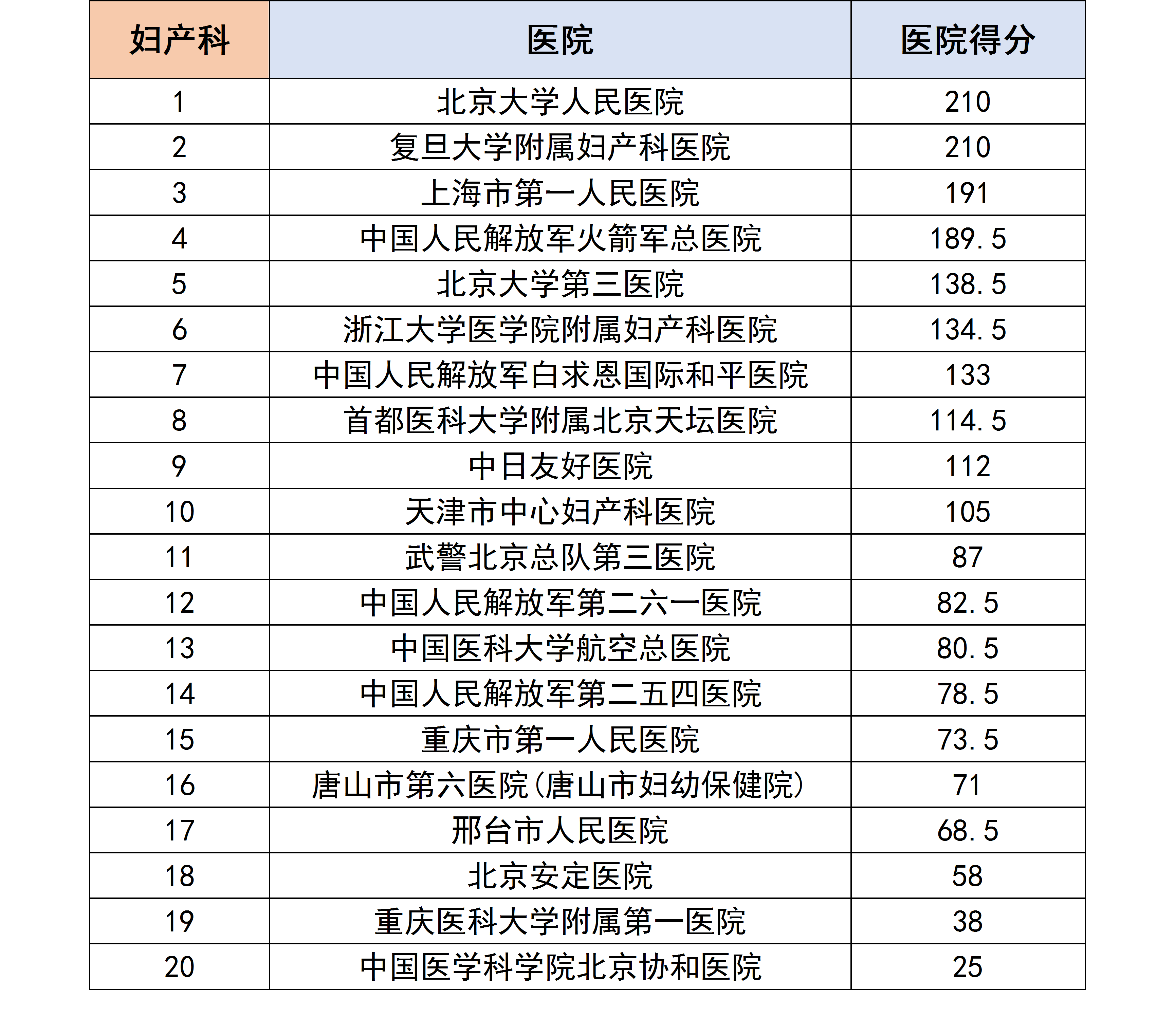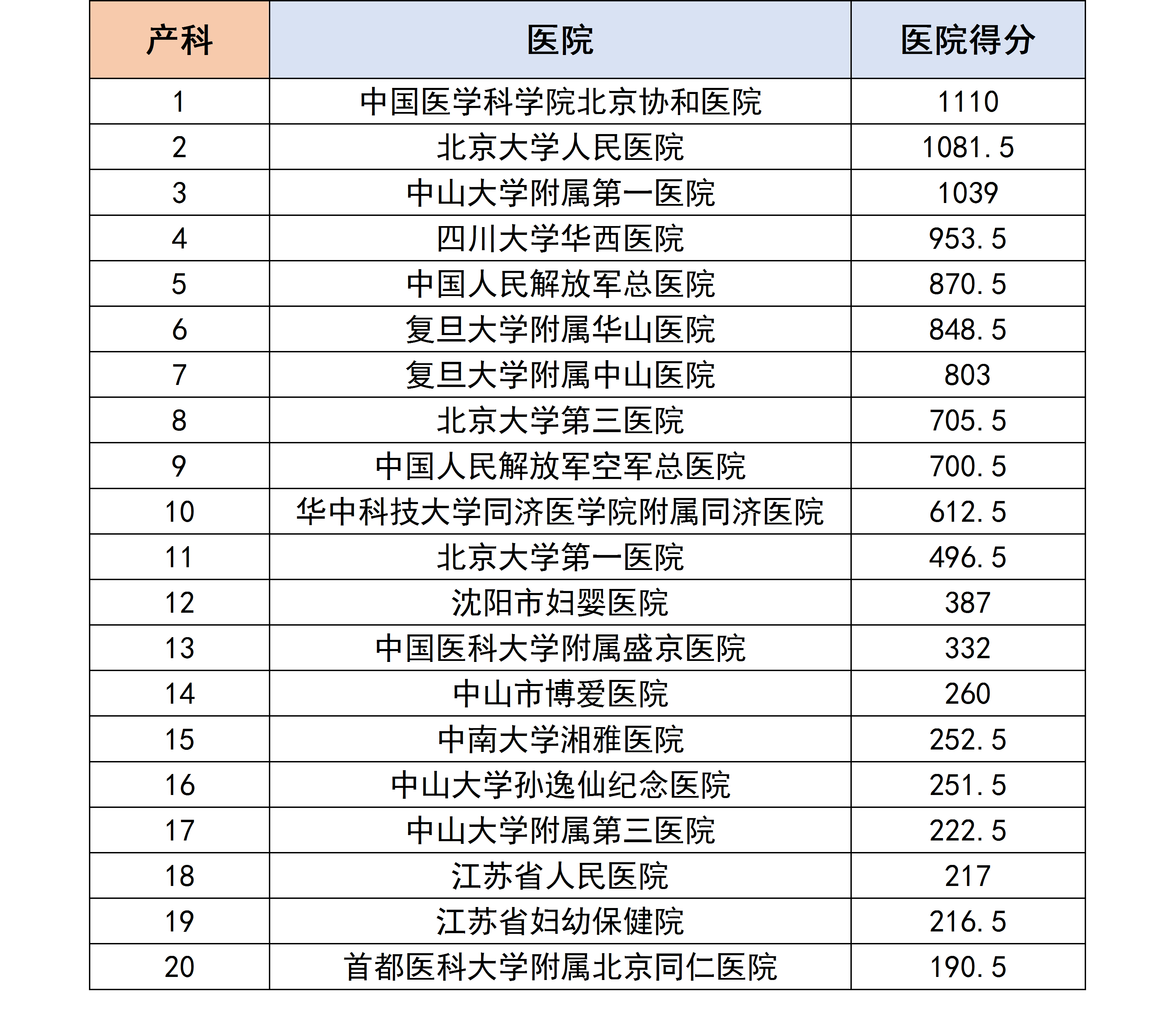 医生们根据自己所在科室,评选和排列出他们认为合理的医院排行榜,我们对各个专科下的医院进行分数统计后,获得了以下专科第一名的医院汇总榜单。