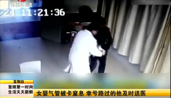 甘肃兰州一9个月大女婴被大豆卡住喉咙,被发现时已失去呼吸且嘴里还吐着血。中午,女婴奶奶抱起她往医院跑,但半路体力不支,瘫坐地上。路过的好心人刘先生见状,赶紧抱女婴跑到医院。