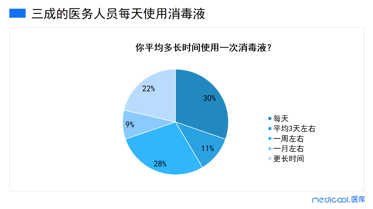 30%医务人员每天使用消毒液,肯定是勤劳的小蜜蜂。11%的医务人员三天用一次消毒液,保证适度干净就满意了。28%的医务人员一周使用一次消毒液,对必要的区域进行清洁。9%的医务人员每月使用一次消毒液,另外,还有一部分医务人员使用消毒液的频率超过一个月,家庭消毒意识较弱。