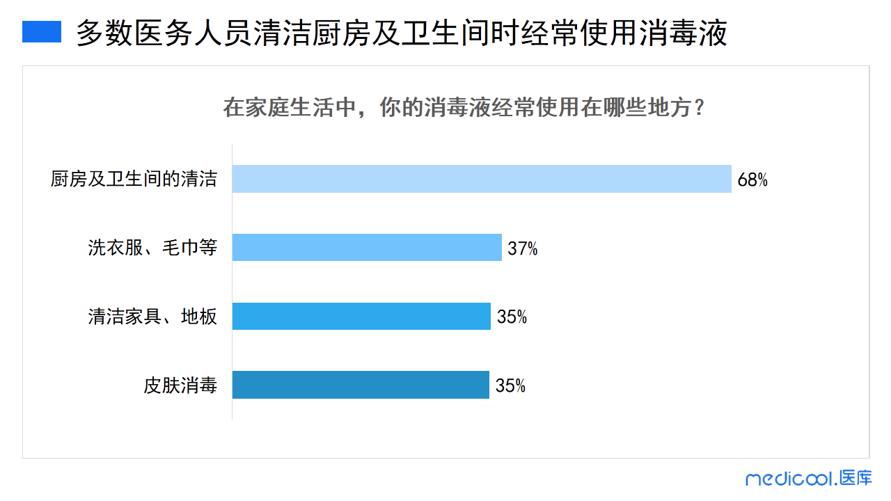 医院是公共场所,消毒无处不在,也是必不可少的。在家庭生活中,32%的医务人员认为很有必要经常使用消毒产品,让自己在洁净的环境中生活得更舒适。