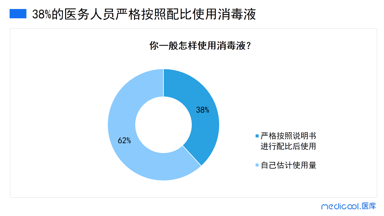 医院使用消毒液都有严格的操作规程。在家里,仅有38%的医务人员会严格按照说明书配比后再使用。62%医务人员在家里使用消毒液还是比较随意的,这个结果出乎意料。