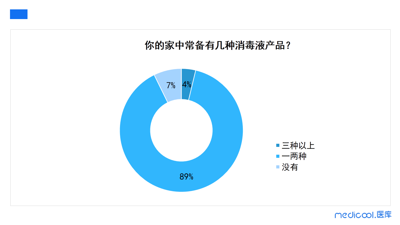 家庭生活中,消毒液需要准备几种呢?89%的医务人员表示家里备有一两种消毒液。一种成分类型或同样用途的消毒液准备一种就够了。