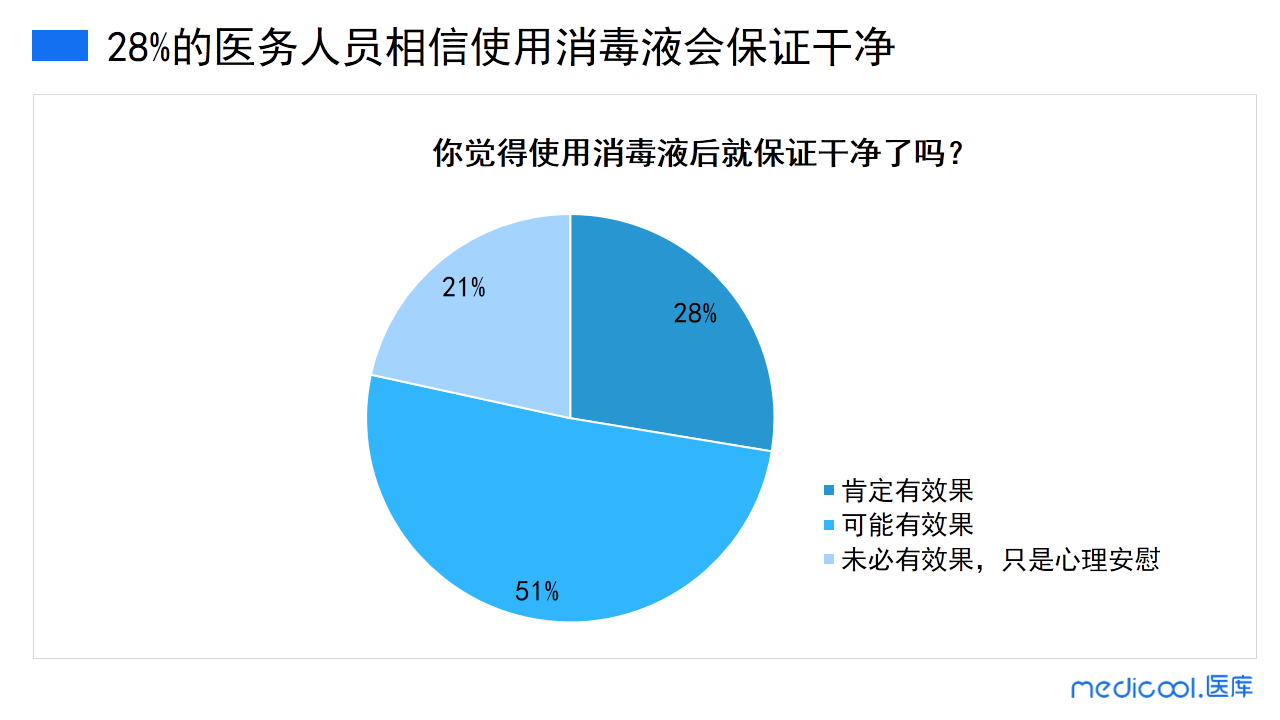 只要严格地按照说明书进行操作,正规消毒产品的消毒功效还是不用怀疑的。然而,21%的医务人员认为消毒液未必有效果,有一半的医务人员觉得可能会有效果。