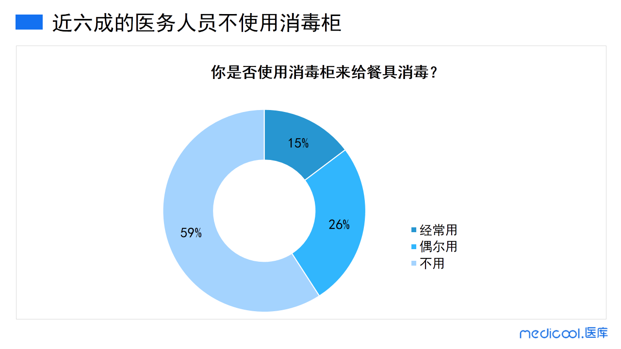 对于消毒柜,很多人认为这是家里可有可无的电器。从本次调研数据可以看出,近六成的医务人员不使用消毒柜给餐具消毒。经常使用消毒柜的医务人员仅占15%。看来,消毒柜在医务人员的家庭中使用率并不高。