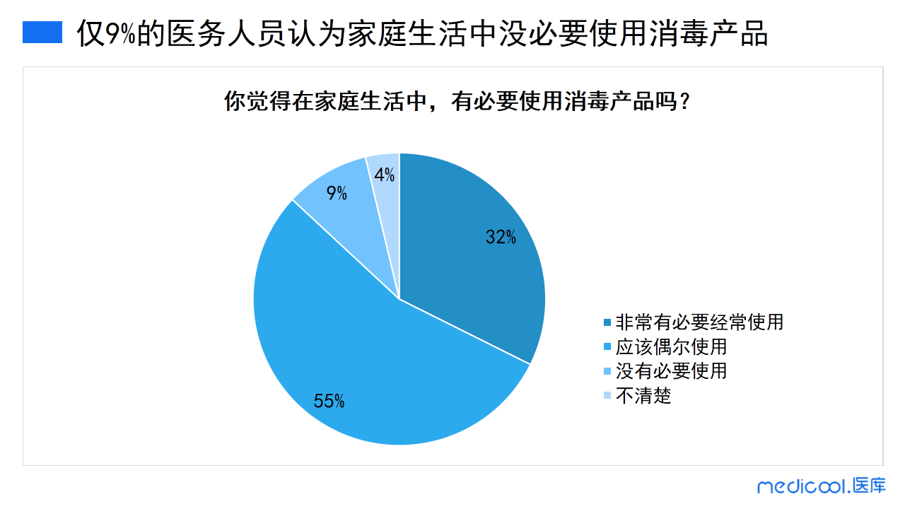 55%的医务人员认为应该偶尔使用消毒产品,不需要过度干净。9%的医务人员认为不需要使用消毒产品,更有4%的医务人员并不清楚是否使用消毒产品,有可能这些医务人员并不参与家务吧!