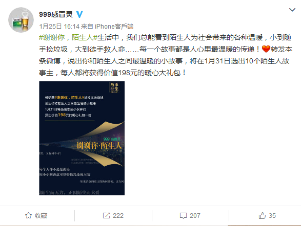 自从赞助了第一期的爸爸去哪儿后,在近5年内,999感冒灵可谓在网络上刷足了眼球,并且先后又赞助了多款综艺和剧集。近期又和“人类实验室”合作,共同推广以“谢谢你,陌生人”为主题的系列微电影,并进行故事征集。用温暖打动人心的方式进行999品牌的推广,出发点自然又感人。