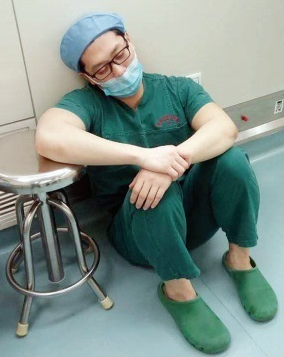 耳鼻喉科医生尹丹辉在连续10小时手术后,侧斜坐在手术室内的踏脚凳上睡着了。