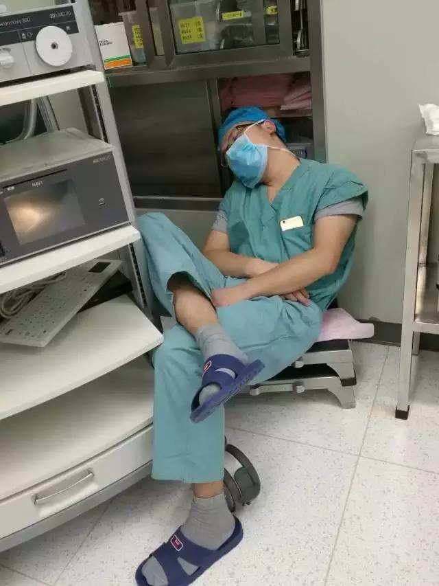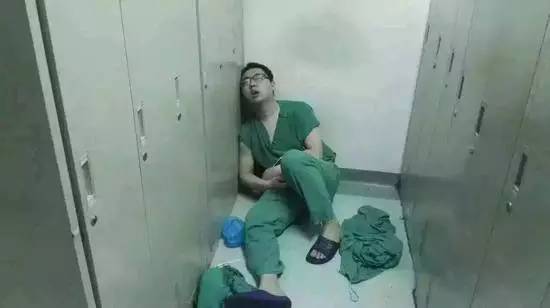 骨科助理医生刘源参加完四场手术后,在更衣室等待洗浴时坐在地上睡着了