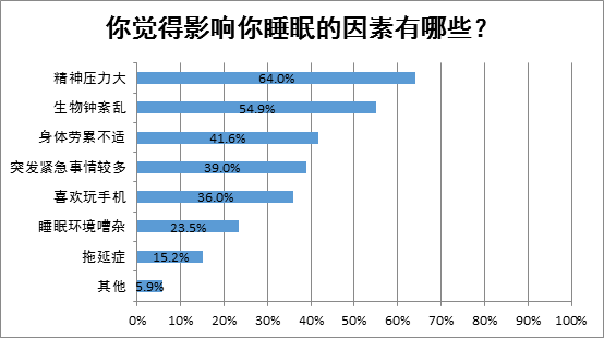 医库调研曾经开展过一个“医务人员睡眠大调查”,从调查中发现,近八成的医生睡眠质量并不好,其中精神压力大和生物钟紊乱是影响医务工作者睡眠质量的主要因素,而身体劳累不适、突发紧急事情较多也是影响他们睡眠的重要因素。