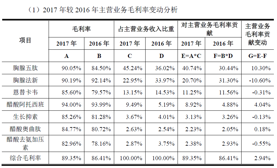 公司主要产品胸腺五肽和胸腺法新的毛利率在2017年都超过了90%。