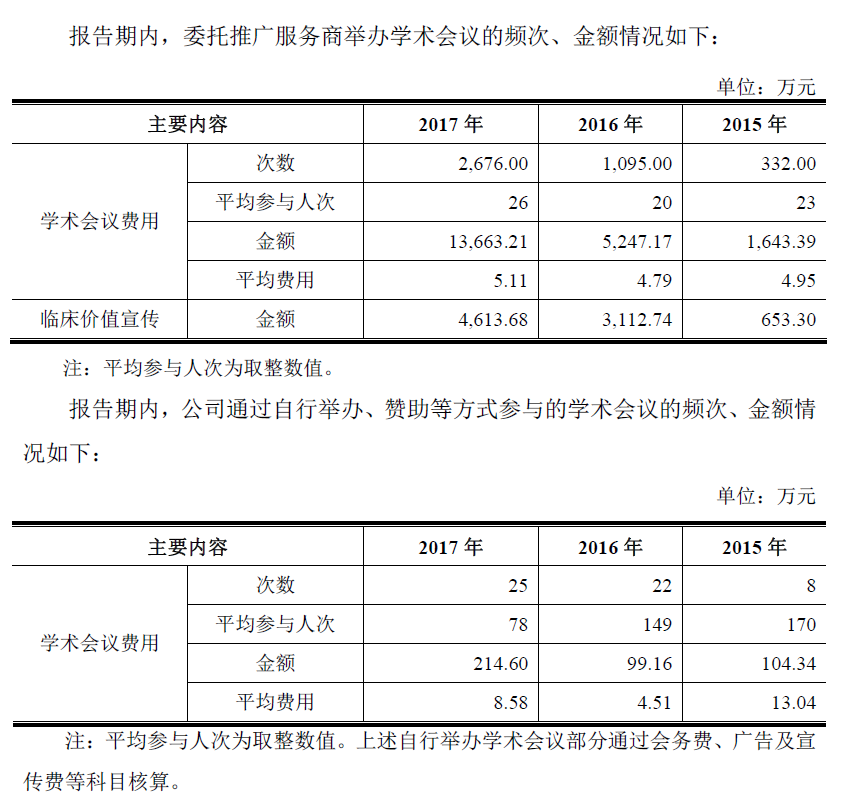 招股说明书中披露,公司的业务推广主要包括学术会议活动。2015-2017年,学术会议费分别为2308.85万元、8359.91万元及18491.49万元,2017年占销售费用的比例超过50%。