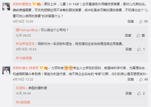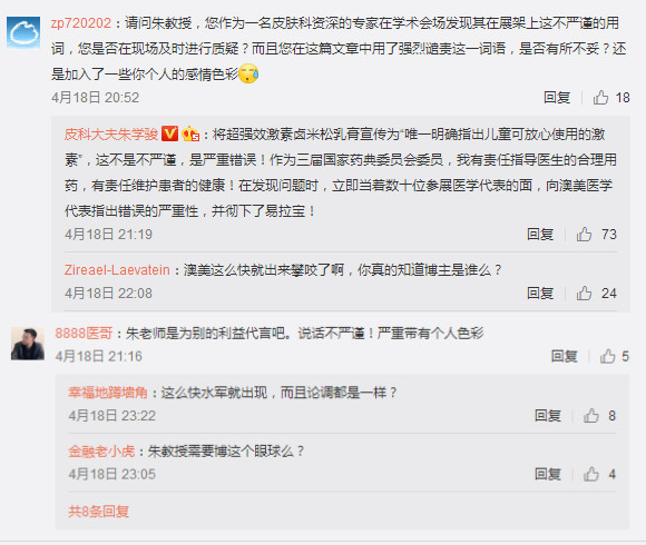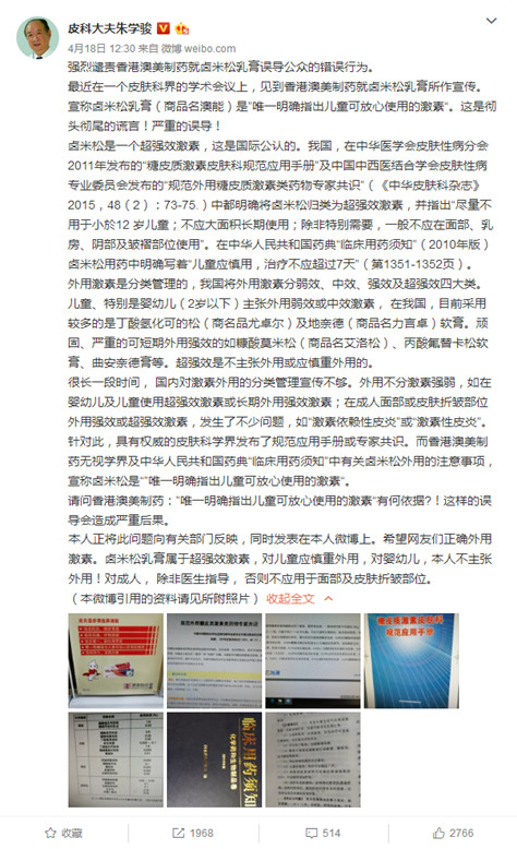 4月18日,“皮科大夫朱学骏”在微博发布长文章称“强烈谴责香港澳美制药就卤米松乳膏误导公众的错误行为。”