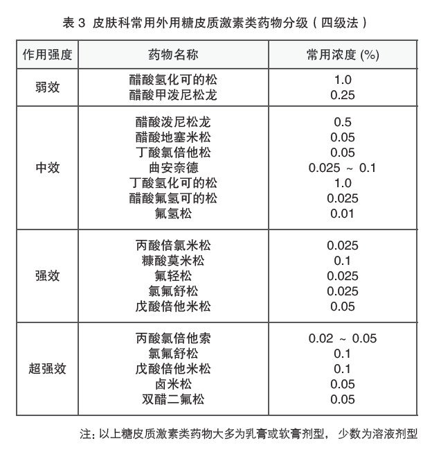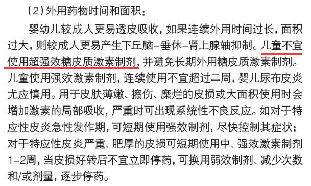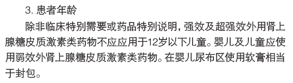 在“外用糖皮质激素类药物的选择原则与用药方法”一节中指出,除非临床特别需要或药品特别说明,强效及超强效外用肾上腺糖皮质激素类药物不应应用于12岁以下儿童。