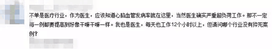 有人说,当今这个社会过劳致死事件比比皆是,并未集中于医疗行业,像IT行业发生过劳致死也不在少数,完全没有必要过度夸大医生过劳死的比例。