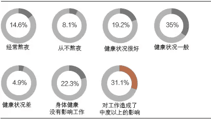 《中国医师执业状况白皮书》显示仅19.2% 的医师认为自己的身体健康状况很好,35% 认为一般,4.9% 认为差;且高达31.1% 的医师认为身体状况对工作造成了中度以上的影响。因而应建立合理的倒班制度、定期进行体检,避免过长加班时间,让医生能有病治病。