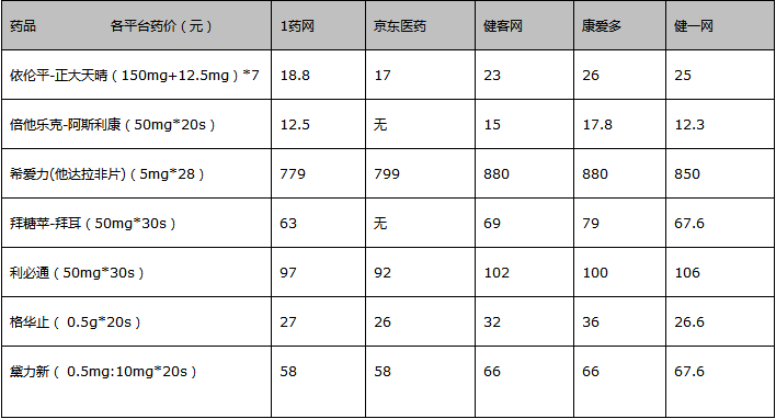 表二是几种常用药品在各自营平台价格对照表,药品种类齐全,综合对比来看,除了京东平台里的少数产品以外,1药网药品价格几乎是全网最低的!