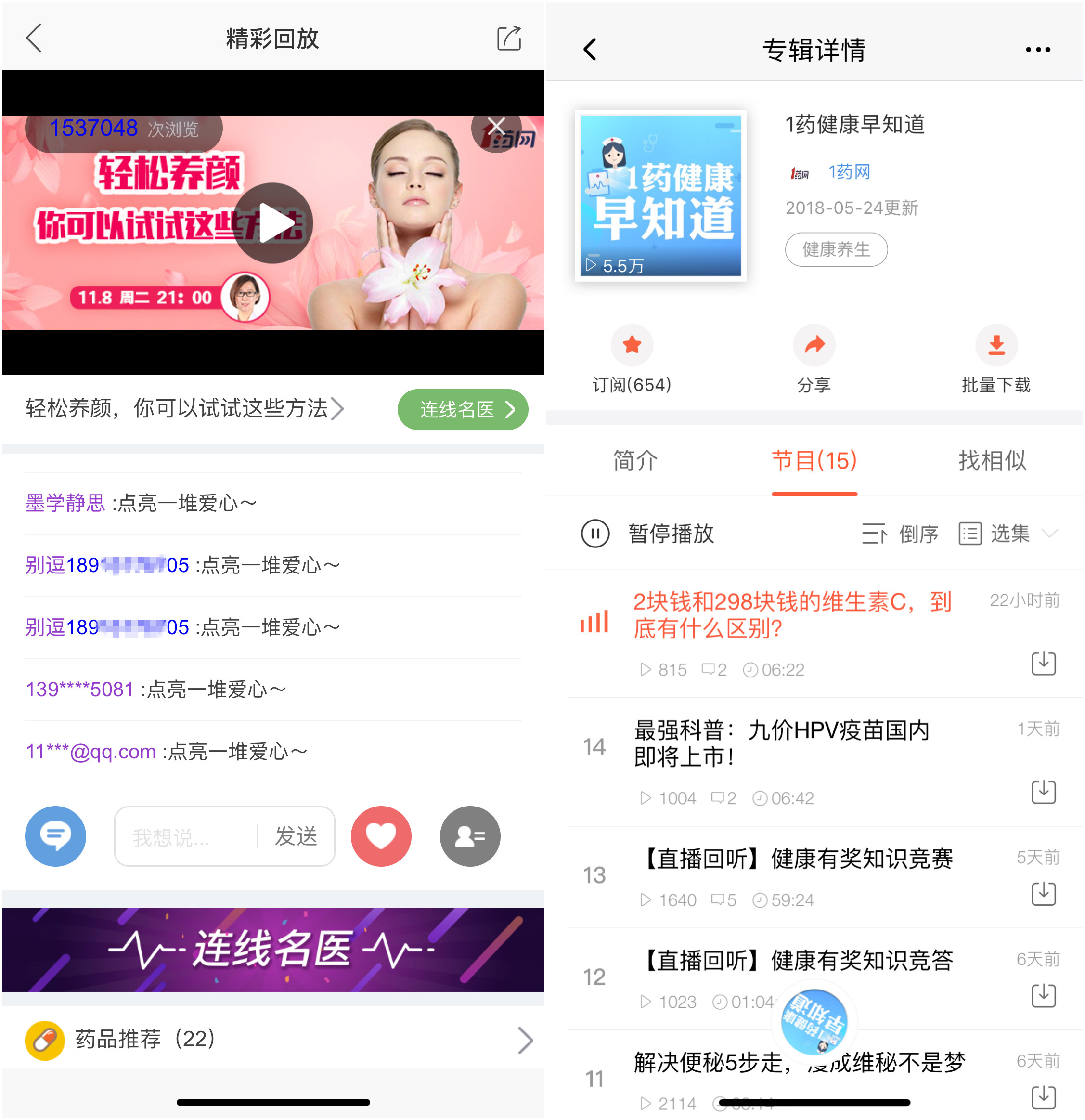 另外,1药网做了很多直播策划,包括平台自有直播,让医生运营,获得流量后进行电商转化;还有在喜马拉雅做的音频直播。1药网的活动策划能力是行业一流,互联网的运营方式也给了我们很大启发,通过C端反向聚合,既能打造客户的持久黏性,又能发力内容端。