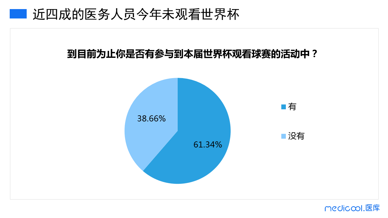 四年一次的世界杯狂欢吸引了全世界人民的目光,但在这其中,不包括38.66%参与调查的医务人员,他们依然要坚守在工作岗位上,没有多余的时间去悠闲地欣赏一场球赛,仅有61.34%的医护观看了世界杯比赛。