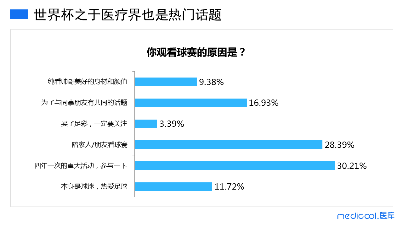 也有占比不小的原因是陪伴家人观看的比赛,占比为28.39%,而为了与同事朋友有话题可聊而去观看比赛的医护也有16.93%,世界杯期间,毕竟全民聊足球。