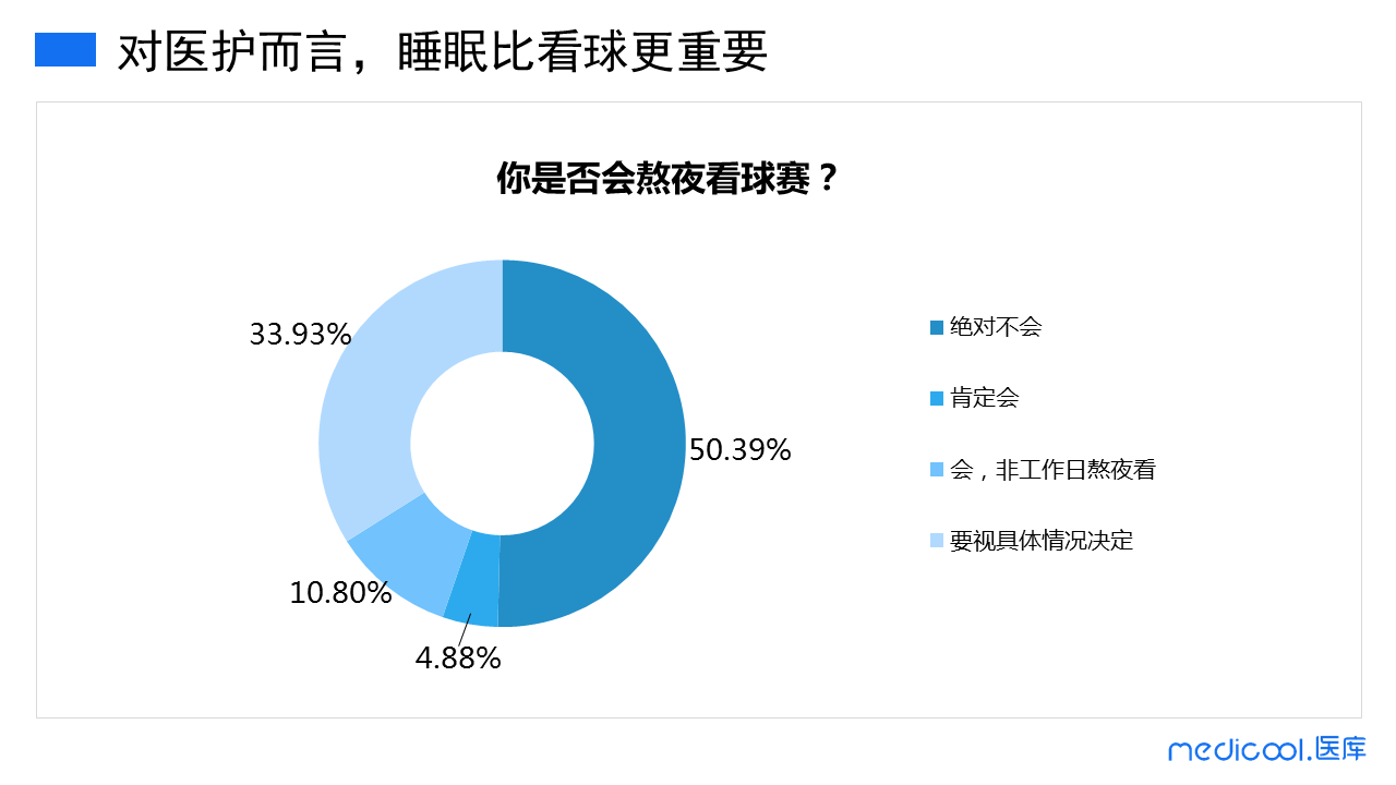 一半的医护坚定的选择了绝对不会熬夜看球,医护本就工作时间长,严重挤占了睡眠时间,在可支配的时间内,医护更愿意选择睡觉而不是看球。33.93%的医护则是灵活机动得视情况决定是否要牺牲睡眠来看球,毕竟遇到喜爱的球队正在比赛,实在无法淡定的入眠呀!